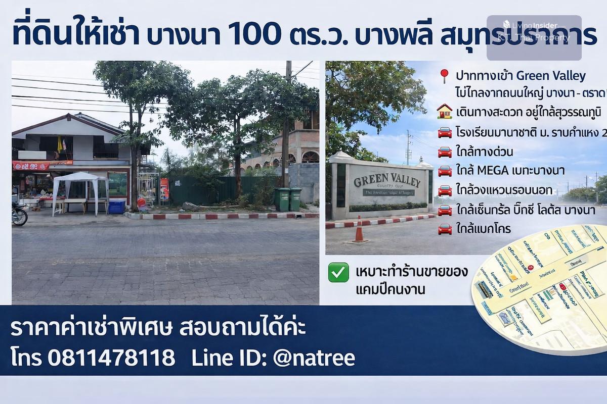 ปล่อยเช่าที่ดินทำเลทอง! หน้าทางเข้า Green Valley บางพลี สมุทรปราการ (100 ตร.ว.)