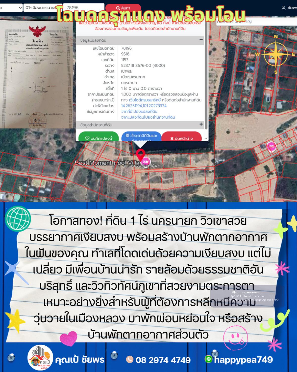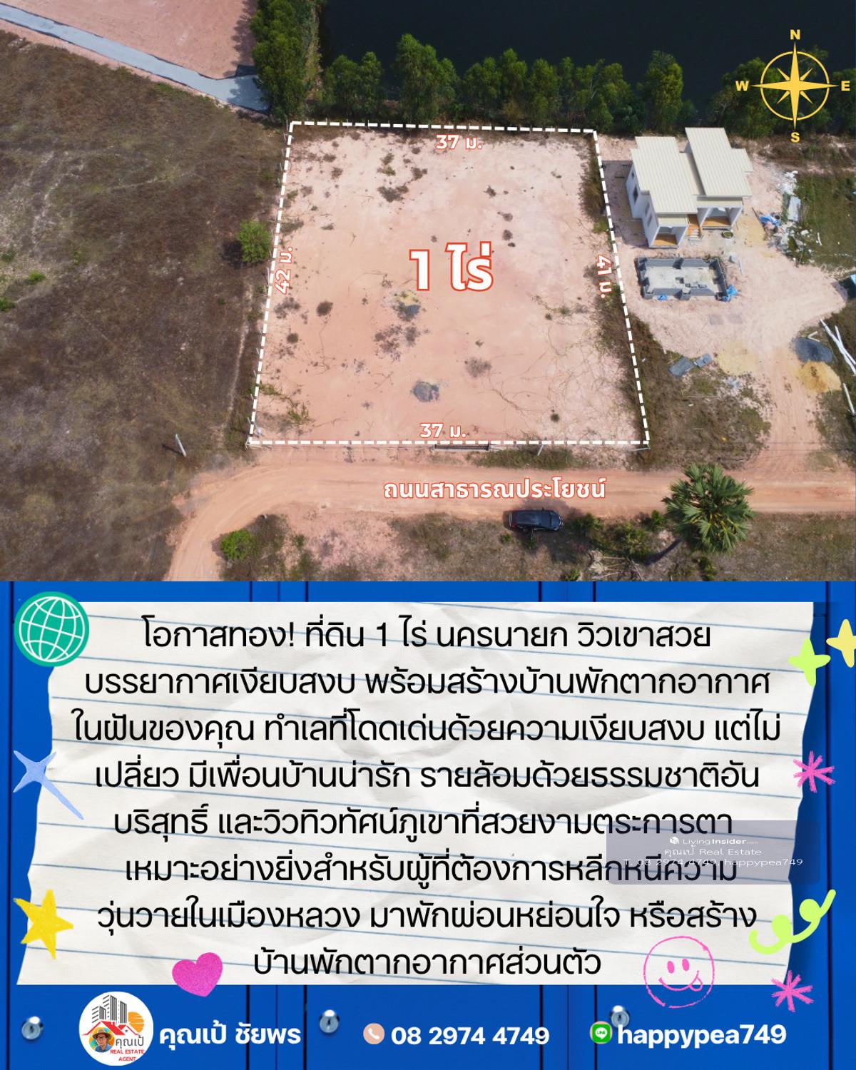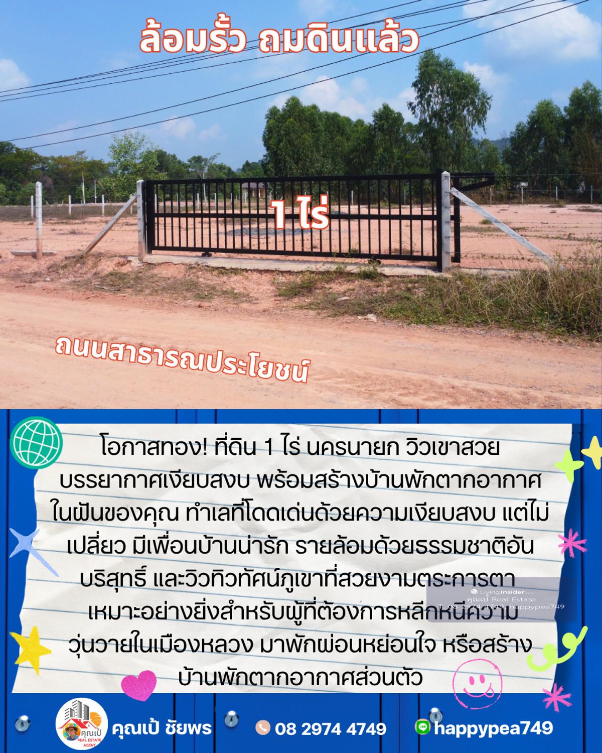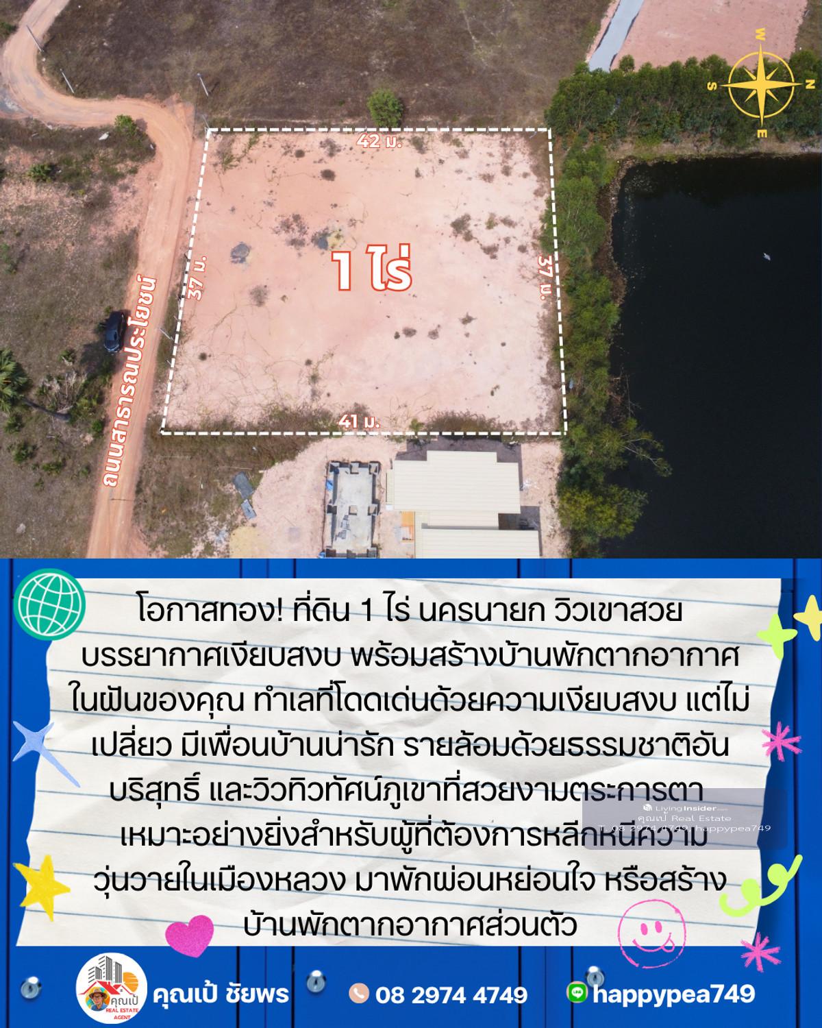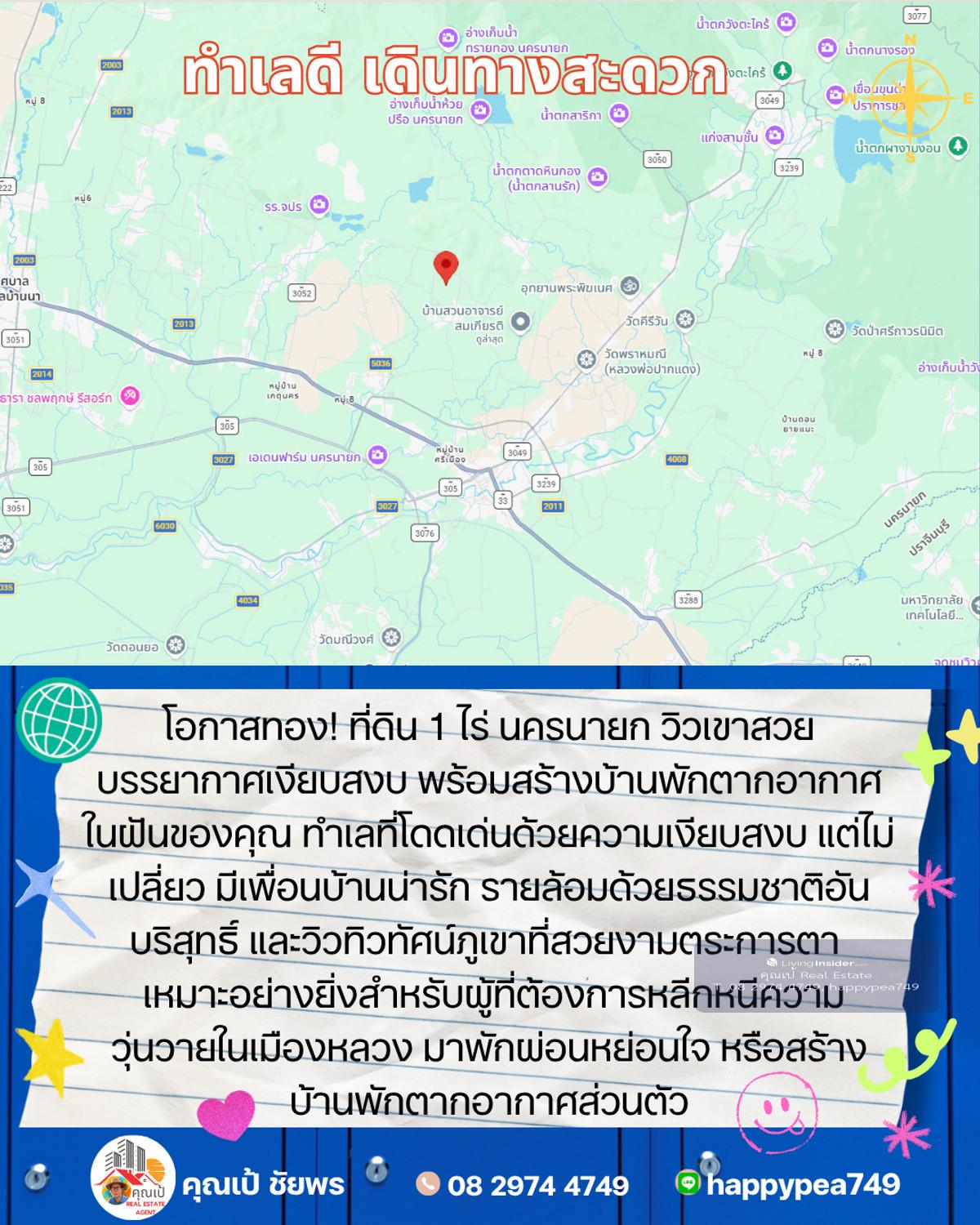 📍 ทำเลศักยภาพ: ต.พรหมณี อ.เมืองนครนายก จ.นครนายก พื้นที่ธรรมชาติ ใกล้เขา วิวสวย อากาศดีตลอดปี บรรยากาศสงบ เป็นส่วนตัว แต่ไม่เปลี่ยว มีเพื่อนบ้าน เหมาะสำหรับอยู่อาศัยจริงหรือทำธุรกิจพักผ่อน 🌿 จุดเด่นที