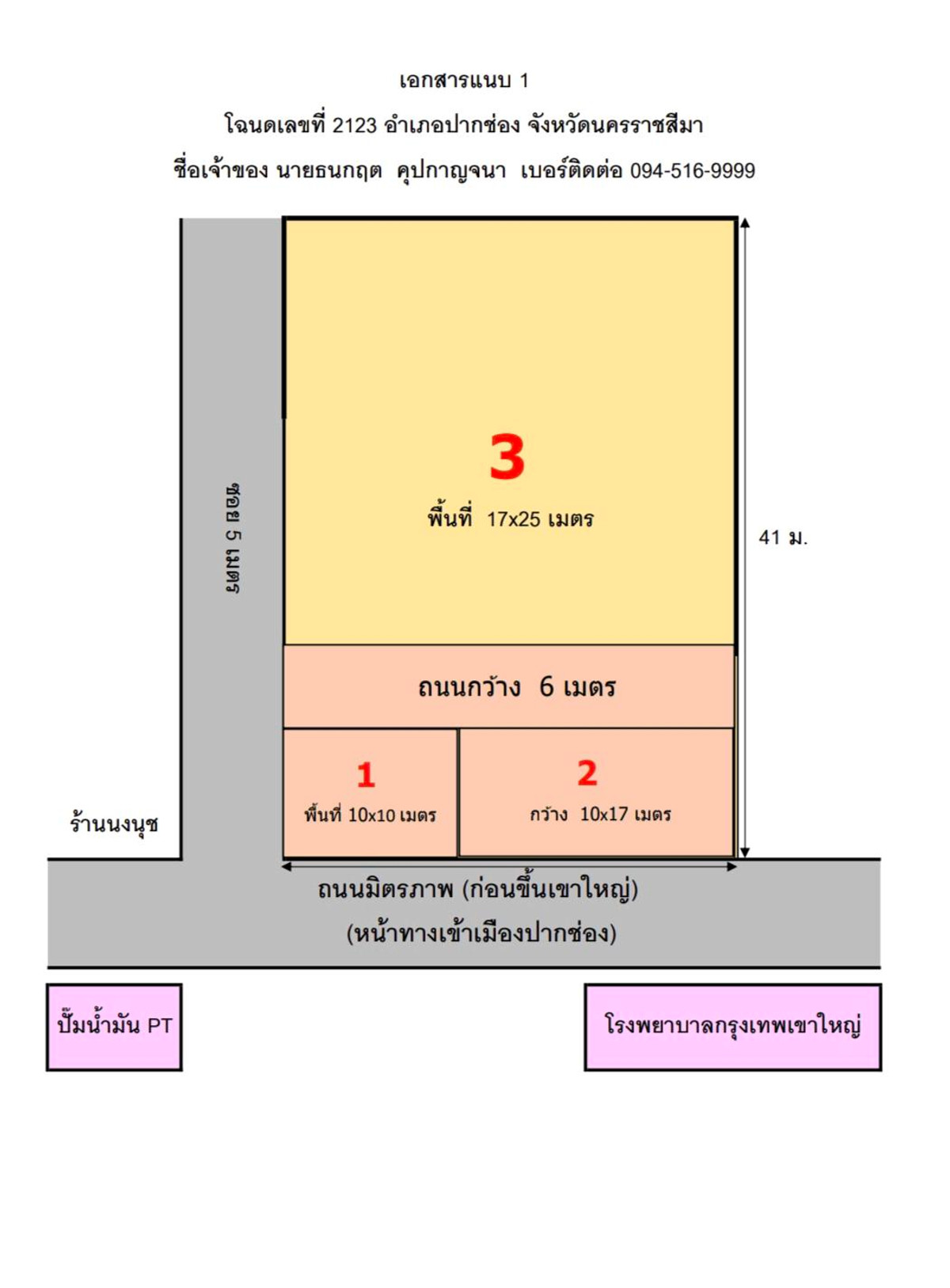 ขายที่ดินสวย ติดถนนใหญ่เส้นทางเข้า ปากช่อง ทำเลเข้าออกสะดวก หน้าติดถนน 26 เมตร ลึก 40 เมตร. แปลงสุดท้ายติดถนน เปิดเป็นโชว์รูม เป็นโกดัง จุดพักทางก่อนขึ้นเขาใหญ่ ราคาต่อรองได้ ต้องการพิกัดแผนที่ หรือ ข