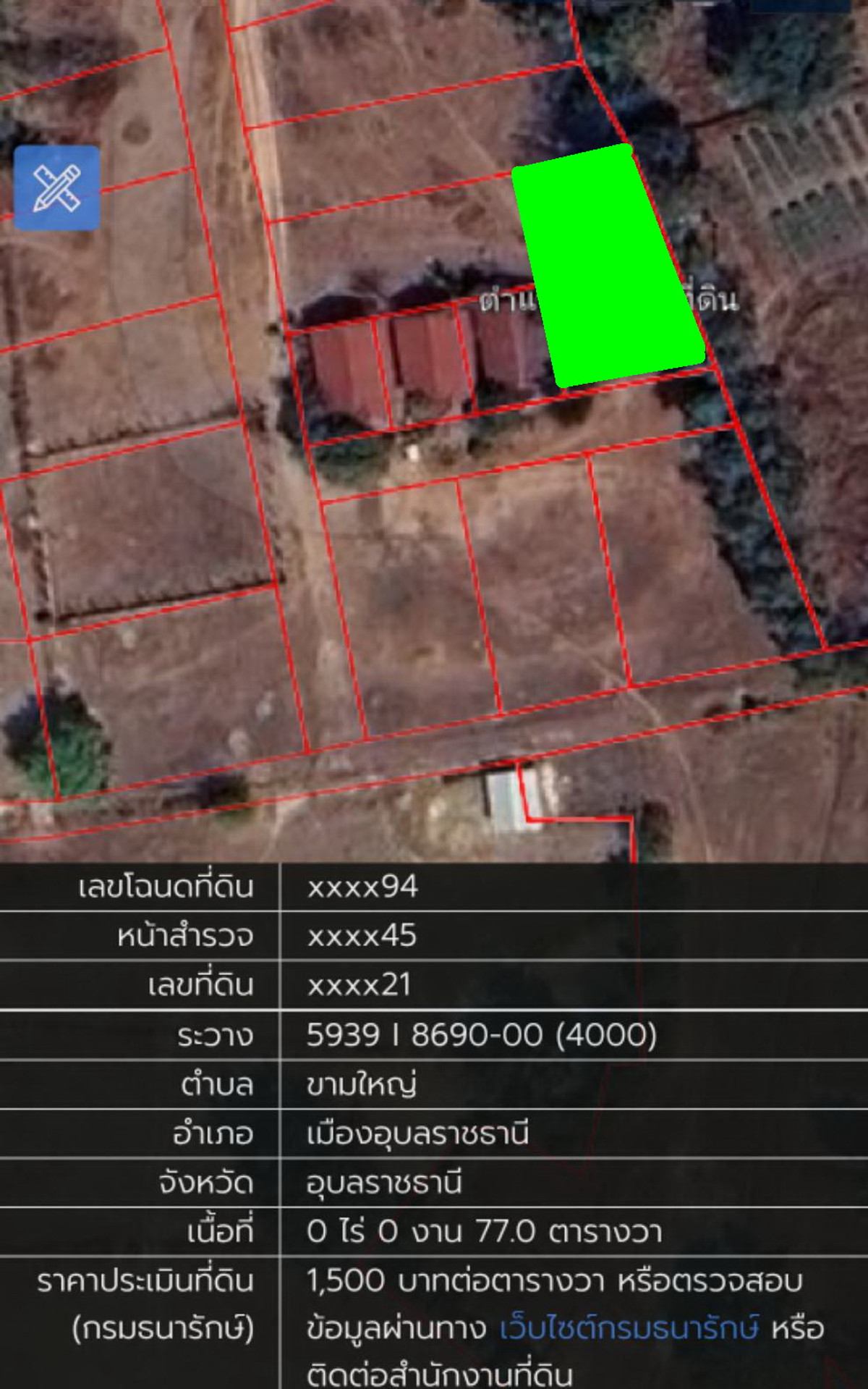 Selling cheap, vacant land, area 77 sq m. The road in front of the land is a dirt road Width approximately 17 meters Facing south Good location, not lonely, in a large community area Convenient entry and exit in many ways 5.5 km from Don Klang Market 6.5 km from Big C 12 km from the airport 11 km from Central Ubon Ratchathani. Km. away from Sappasit Prawasong Hospital, 12 km. Located in Kham Yai Subdistrict, Mueang Ubon Ratchathani District. Ubon Ratchathani Province Price 390,000 including transfer Red Garuda title deed document If interested, ask for more details at Khun Nokkaek Tel. Contact number line id. nokkaknokkak