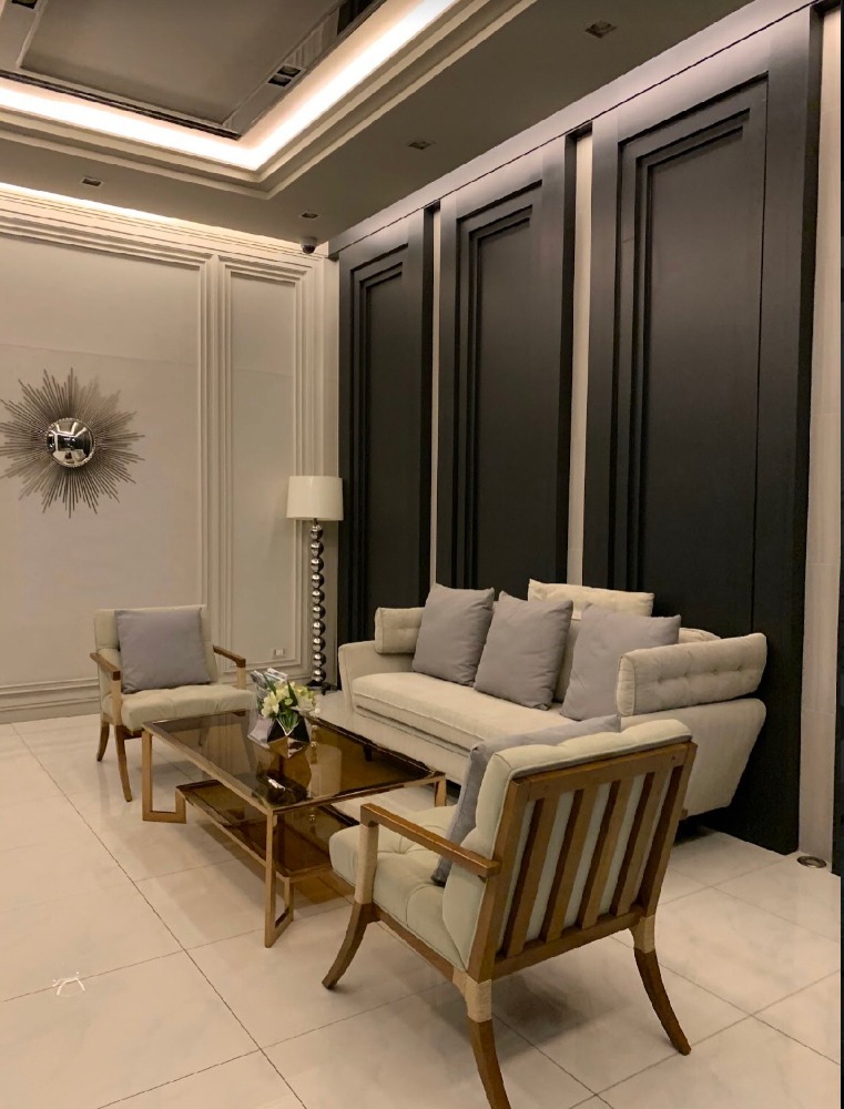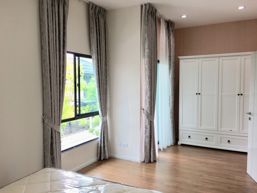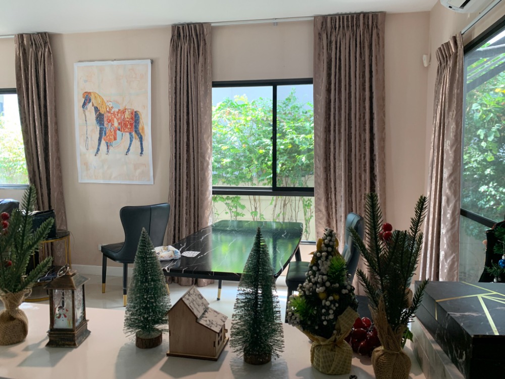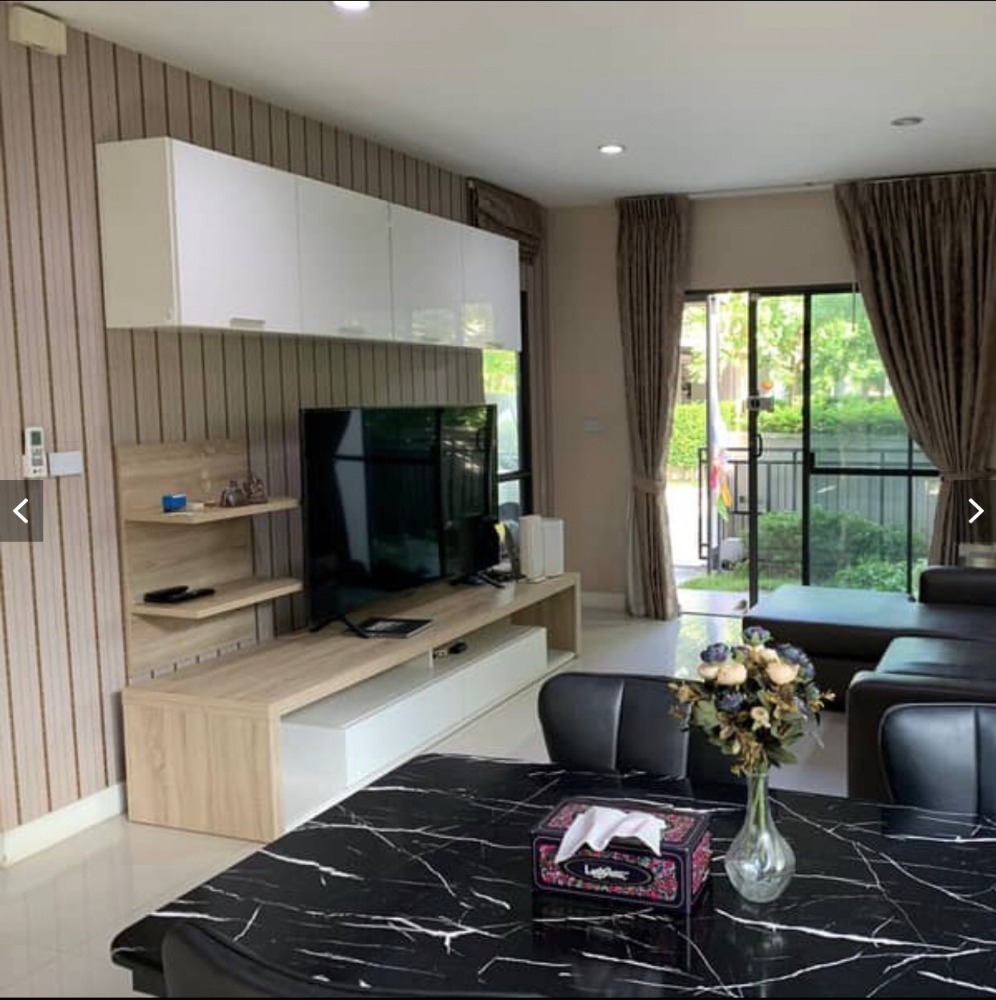 House for rent in the middle of Rama 9 city, beautifully decorated, luxuriously decorated, air conditioned, fully furnished, rental price 27,000 baht per month.