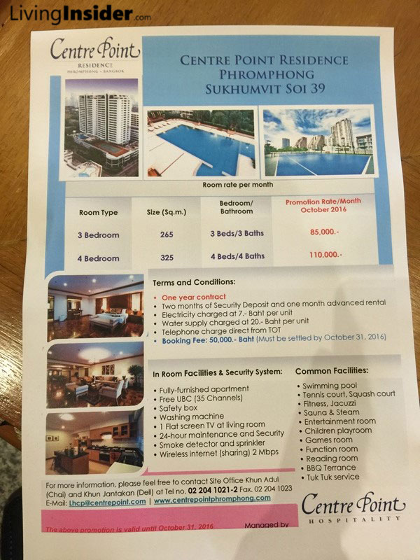 1. Center Point Residence Phrompong ไม่น่าเชื่อว่าที่นี่จะไม่มีห้องเล็กให้เช่าเลยครับ เล็กที่สุดคือ 3 ห้องนอน ขนาด 265 ตรม. ค่าเช่า 85,000 บาทต่อเดือน ไม่รวมน้ำไฟ (ค่าไฟคิดหน่วยละ 7 บาท ค่าน้ำหน่วยละ 20 บาท) ตอนที่สอบถามมีห้องว่างเหลือไม่กี่ห้องครับ