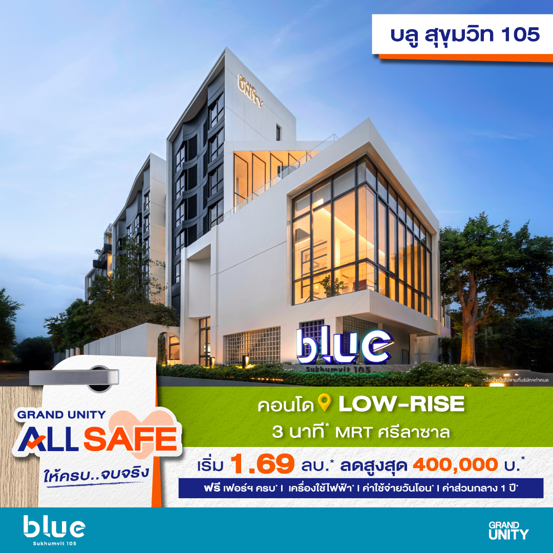 1. บลู สุขุมวิท 105 (blue Sukhumvit 105) คอนโดมิเนียมโลว์ไรส์ใจกลางลาซาล เพียง 3 นาที* ถึง MRT สถานีศรีลาซาล ห้องหน้ากว้าง ฟังก์ชันดี เป็นสัดส่วน เฟอร์นิเจอร์และเครื่องใช้ไฟฟ้าครบ* พิเศษ ราคาเริ่มต้น 1.69 ล้านบาท*