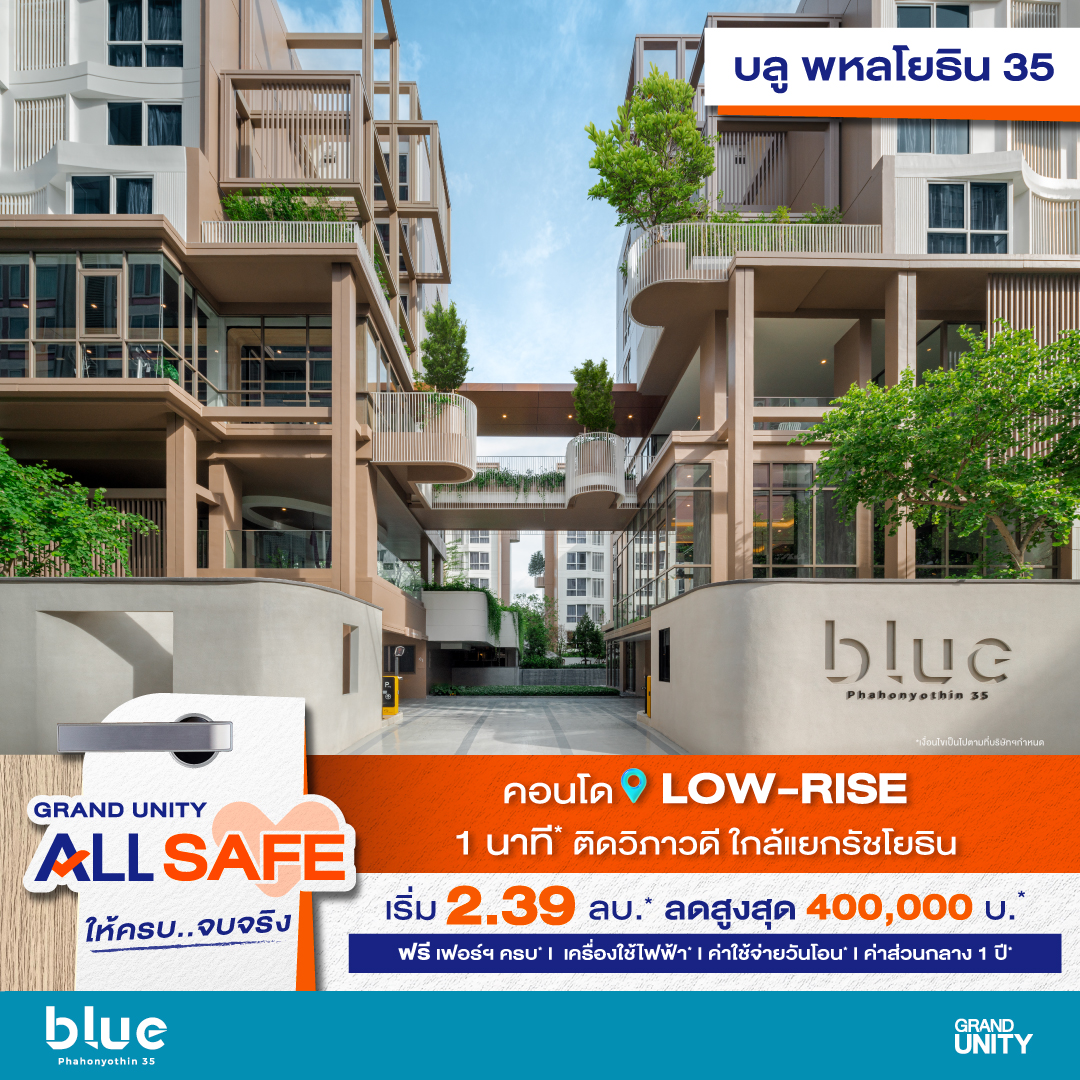 3. บลู พหลโยธิน 35 (blue Phahonyothin 35) คอนโดมิเนียมโลว์ไรส์สไตล์รีสอร์ต 1 นาที* ใกล้ถนนวิภาวดีรังสิตและแยกรัชโยธิน เชื่อมต่อการเดินทางสู่ใจกลางเมืองได้อย่างสะดวกสบาย ออกแบบด้วยแนวคิด Multi-Functional Design พิเศษ ราคาเริ่มต้น 2.39 ล้านบาท*