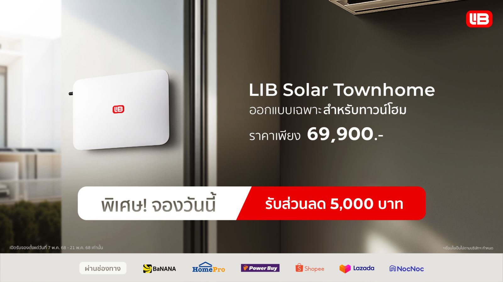 LIB Solar Townhome ราคา 69,900 บาท พร้อมโปรโมชันสำหรับพรีออเดอร์ รับส่วนลดพิเศษ 5,000 บาท ตั้งแต่วันที่ 7-21 พฤษภาคม 2568 เท่านั้น