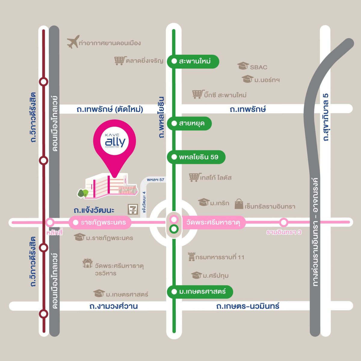 โครงการ Kave Ally แจ้งวัฒนะ โดดเด่นด้วยโลเคชัน เนื่องจากตั้งอยู่ตรงข้าม มหาวิทยาลัยราชภัฏพระนคร และใกล้มหาวิทยาลัยอีกมากมกาย อาทิ มหาวิทยาลัยเกริก มหาวิทยาลัยศรีปทุม และมหาวิทยาลัยเกษตรศาสตร์ ทั้งยังมีแหล่งงานสำคัญ ทั้งสำนักงานใหญ่ กลุ่มมิตรผล-บ้านปู และศูนย์ราชการแจ้งวัฒนะ