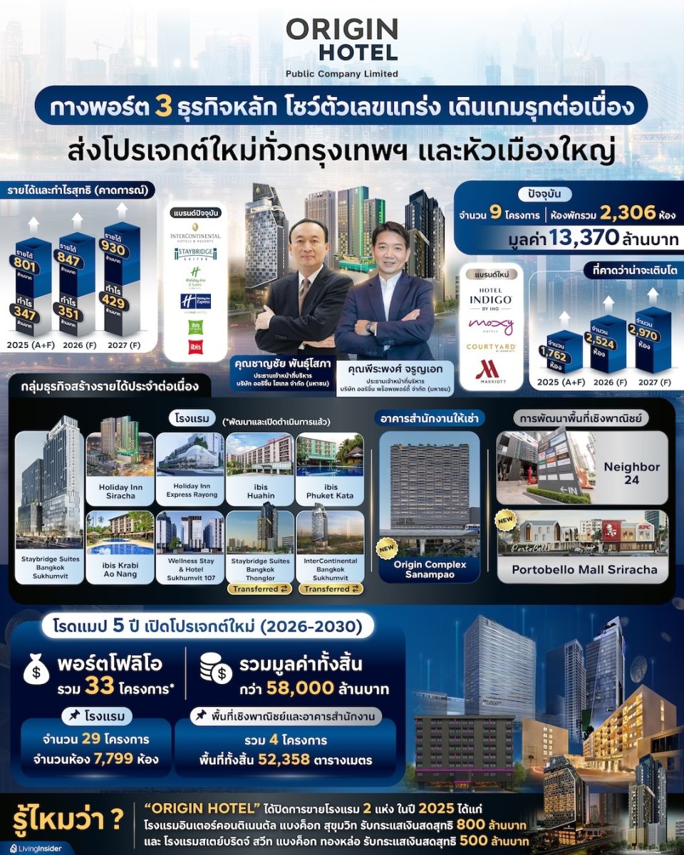 ในอีก 𝟱 ปีข้างหน้า "𝗢𝗥𝗜𝗚𝗜𝗡 𝗛𝗢𝗧𝗘𝗟" จะมีโครงการในมือทั้งหมดมากถึง 𝟯𝟯 โครงการ* มูลค่ารวมทั้งสิ้นกว่า 𝟱𝟴,𝟬𝟬𝟬 ล้านบาท ภายในปี 𝟮𝟬𝟯𝟬