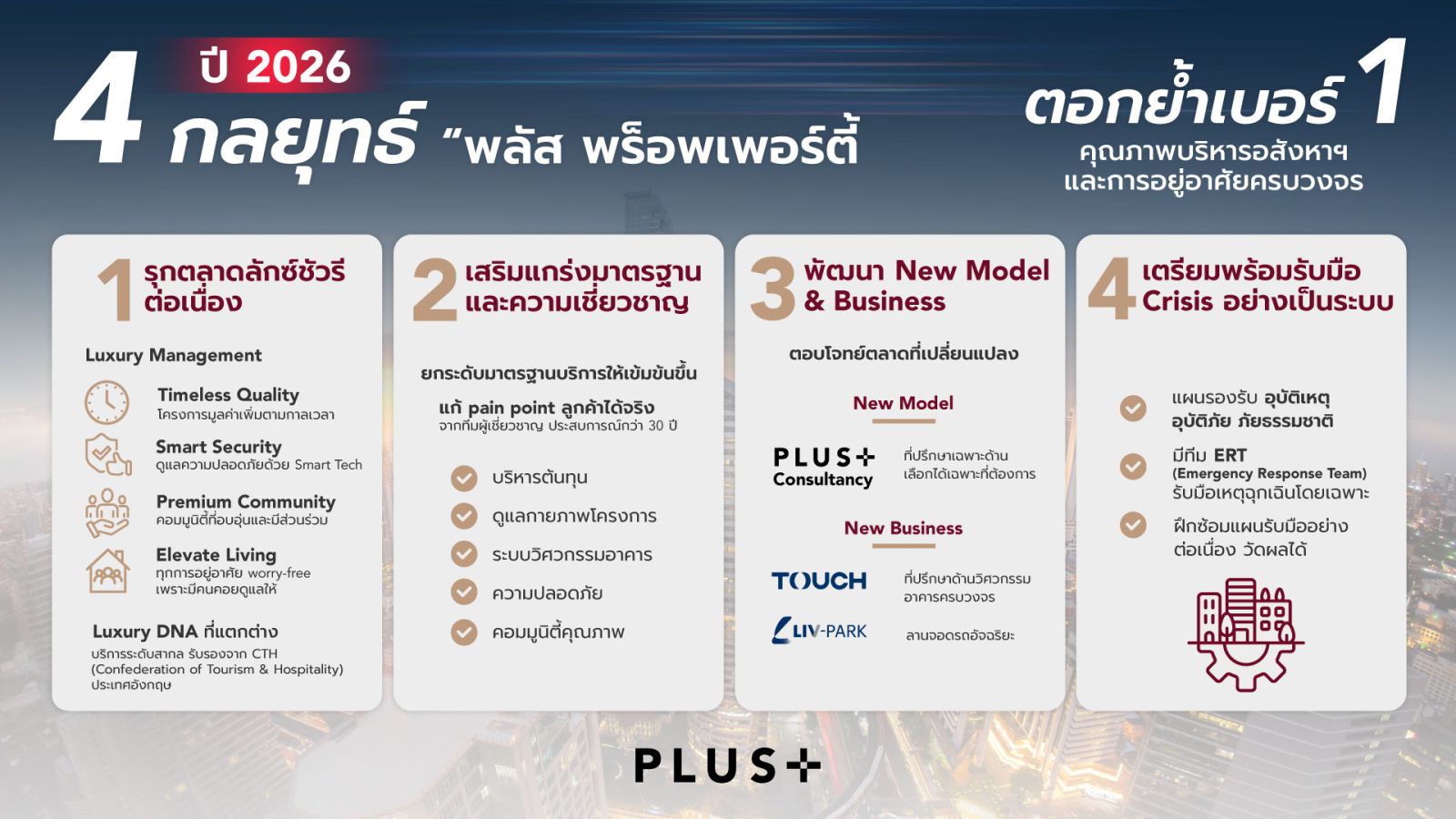 เสริมแกร่งมาตรฐานและความเชี่ยวชาญ จุดแข็งของพลัสฯ คือการบริหารจัดการที่แก้ Pain Point ลูกค้าได้จริง จากทีมงานผู้เชี่ยวชาญที่มีประสบการณ์กว่า 30 ปี ทั้งการบริหารต้นทุน การดูแลกายภาพอาคาร ระบบวิศวกรรม ความปลอดภัย และการสร้างคอมมูนิตี้คุณภาพ ปีนี้บริษัทเดินหน้ายกระดับมาตรฐานการทำงานให้เข้มข้นยิ่งขึ้น เพื่อให้ทุกโครงการได้รับการดูแลอย่างมืออาชีพและมีประสิทธิภาพสูงสุด