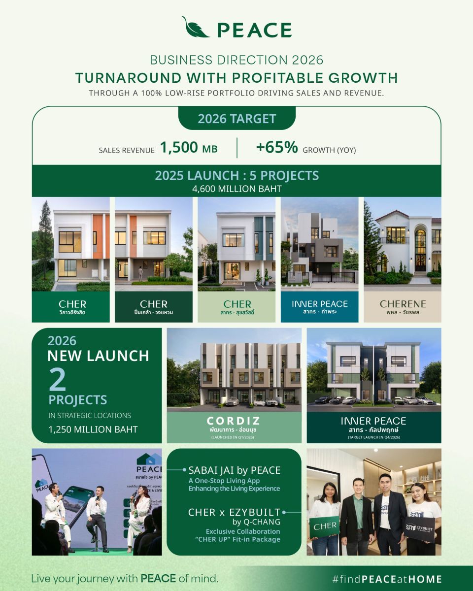 สำหรับปี 2569 จะเป็นปีแห่งการเติบโตอย่างแข็งแกร่งต่อเนื่องของ PEACE ด้วยกลยุทธ์ที่ชัดเจนและการโฟกัสในตลาดแนวราบ 100% ทำให้บริษัทมั่นใจว่าจะสามารถสร้างการเติบโตอย่างมั่นคงได้ต่อเนื่อง พร้อมผลักดันยอดขายให้เป็นไปตามเป้าหมายที่วางไว้ 1,500 ล้านบาทได้อย่างแน่นอน ” นายโดม กล่าว