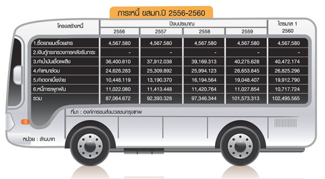 อีกทั้งมีการเพิ่มบทบาท ขสมก. หารายได้จากการบริหารทรัพย์สินเชิงธุรกิจ ซึ่ง ขสมก.มอบให้เอกชนเช่าพื้นที่อู่จอดรถพัฒนาเชิงพาณิชย์ 2 แห่ง ได้แก่ อู่มีนบุรี และอู่บางเขน ผลการศึกษามีกำหนดแล้วเสร็จเดือน ก.ค.นี้ โดยจะดำเนินการตาม พ.ร.บ.การให้เอกชนร่วมลงทุนในกิจการของรัฐ พ.ศ. 2556