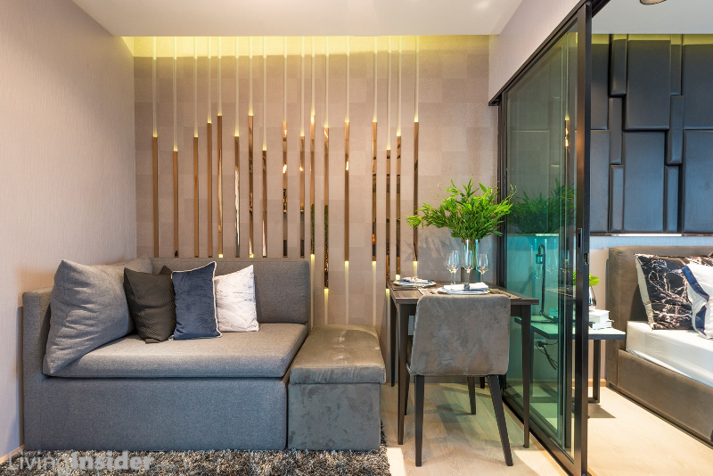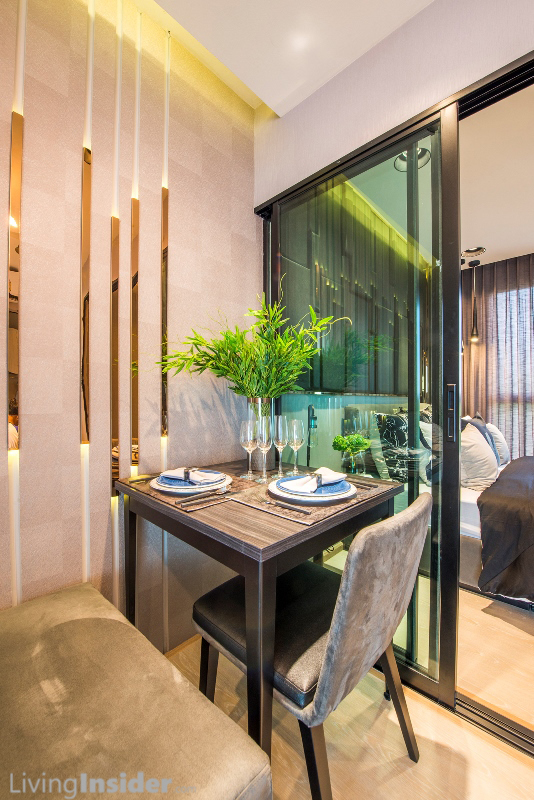 ถือว่าฟังชั่นครบพอสมควรครับ มีพื้นที่ให้วางโต๊ะทานข้าวได้ด้วย หลายคอนโดไม่มีพื้นที่ตรงนี้ ต้องนั่งกินข้าวกับโต๊ะกลางหน้าโซฟา แต่ที่นี่มีพื้นที่ให้วางได้ ผมชอบไอเดียที่เขาให้คนนั่งอีกคน นั่งใช้งานโต๊ะทานข้าวจากโซฟาได้ด้วย เพราะออกแบบโซฟาให้ไม่มีที่วางแขน เป็นไอเดียที่ประหยัดพื้นที่ดีครับ ไม่ต้องมีเก้าอี้ 2 ตัว