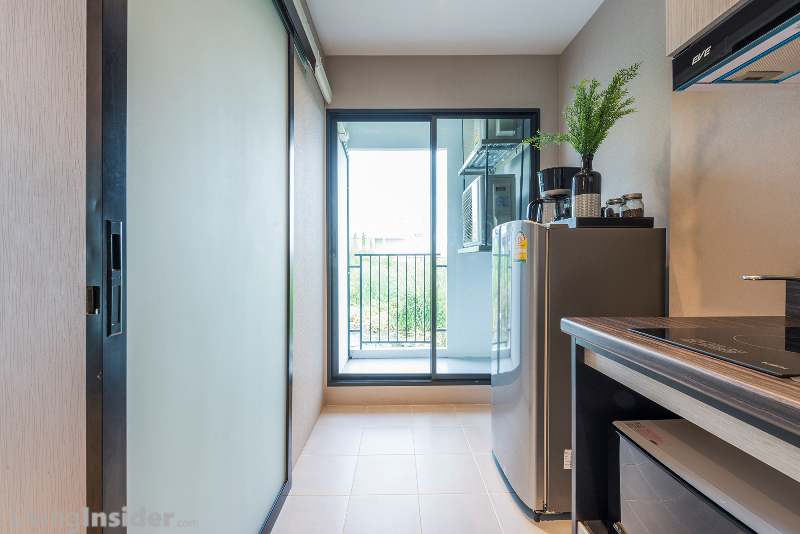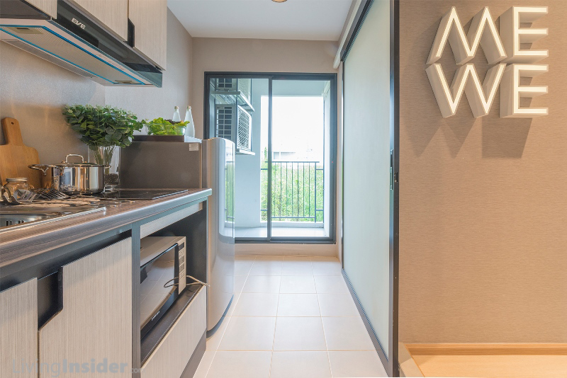 ครัวมีประตูเลื่อนกั้นปิดได้และเชื่อมต่อระเบียง ทำอาหารได้จริงจัง ระบายอากาศได้ดี