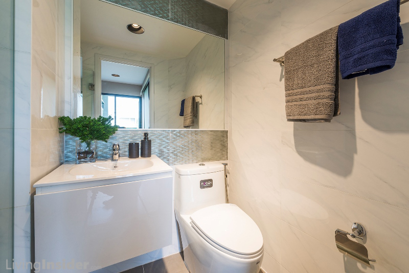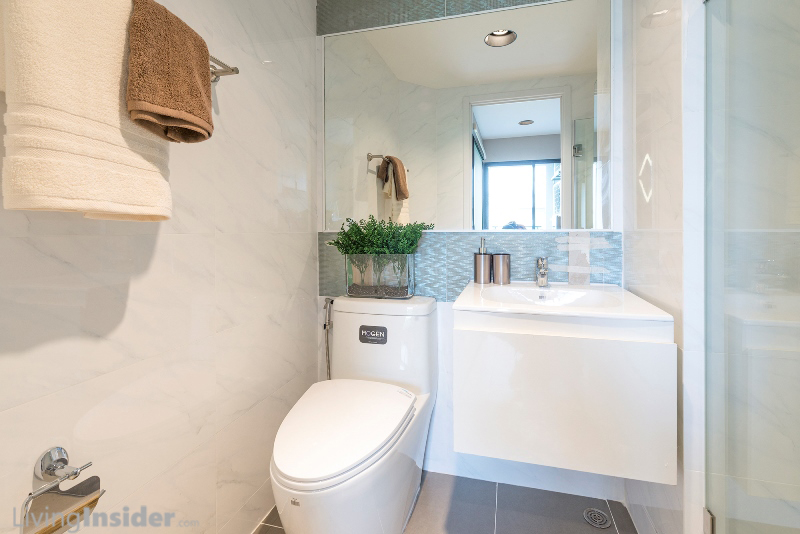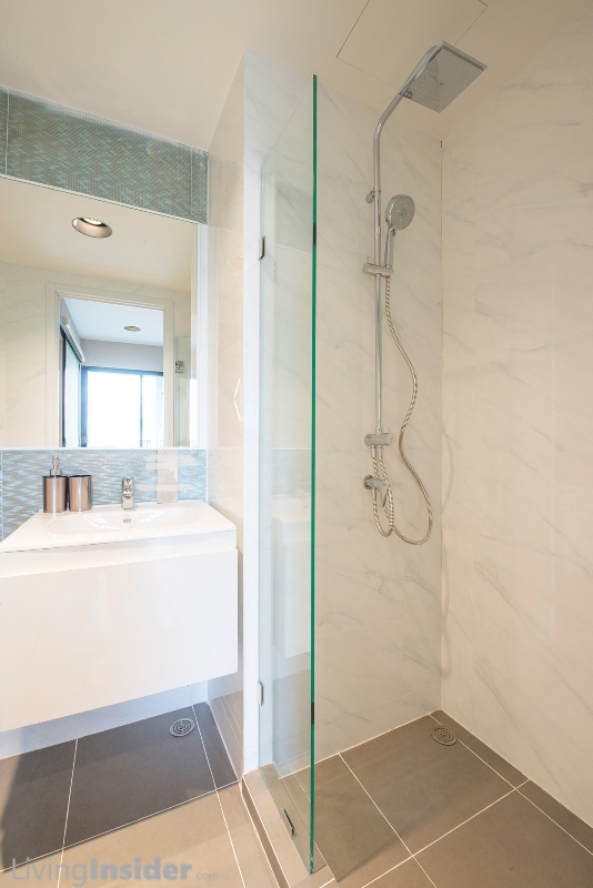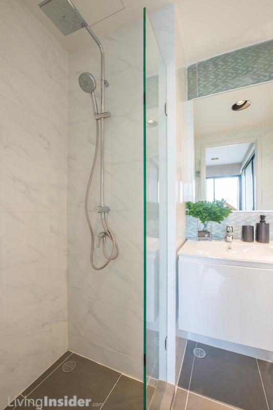 ห้องน้ำถือว่าให้เกินมาตรฐานคอนโดระดับราคาแบบนี้ครับ สุขภัณฑ์ใช้ของคุณภาพ ผนังใช้กระเบื้องลายหินอ่อนดูดีทีเดียว มี Rain Shower ให้ด้วย กระจกกั้นอาบน้ำก็ติดตั้งให้เสร็จสรรพ