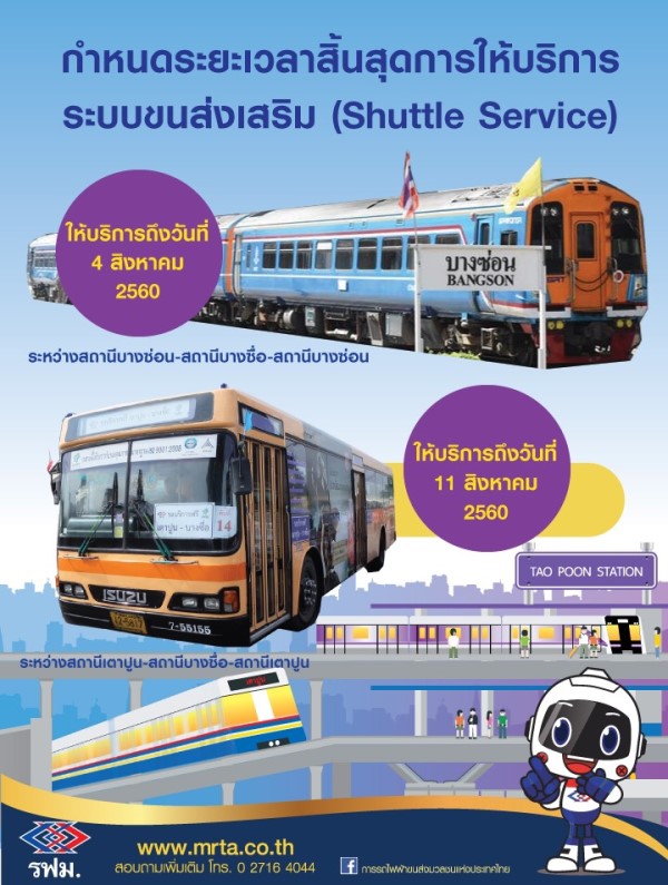 การรถไฟฟ้าขนส่งมวลชนแห่งประเทศไทย (รฟม.) ขอแจ้งสิ้นสุดการให้บริการระบบขนส่งเสริม (Shuttle Service) ระหว่างสถานีเตาปูน – สถานีบางซื่อ โดยการให้บริการเดินรถไฟชานเมือง เพื่อเชื่อมต่อการเดินทางระหว่างสถานีบางซ่อน – สถานีบางซื่อ ของรฟม. จะสิ้นสุดลงในวันที่ 4 สิงหาคม 2560 และการให้บริการเดินรถโดยสารปรับอากาศ ระหว่างสถานีเตาปูน – สถานีบางซื่อ ของ ขสมก. จะสิ้นสุดลงในวันที่ 11 สิงหาคม 2560