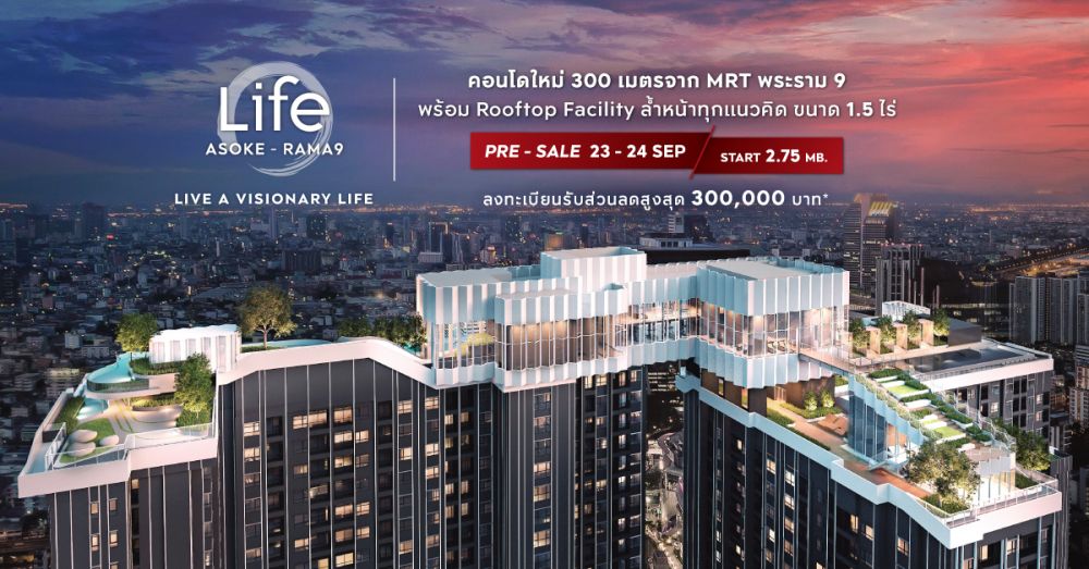 เตรียมเปิดขายโครงการ ‘Life Asoke-Rama 9’ (ไลฟ์ อโศก-พระราม 9) คอนโดคุณภาพที่มาพร้อมกับ Rooftop Facility ที่มโหฬารที่สุดในย่านนี้ (1.5 ไร่) และจัดเต็มพื้นที่บนดาดฟ้า 360 Panoramic View ขนาดใหญ่เชื่อมกัน ที่ความสูงต่างระดับ 3 ชั้น พร้อมสระว่ายน้ำ 3 สระ ทั้งแบบมาตรฐานโอลิมปิก ยาว 50 เมตร , 45 เมตร และสระ 23 เมตร ขอบกระจกระฟ้าแบบ Aquarium Sky Pool พร้อม Fitness สองชั้น ..พื้นที่ด้านล่างส่วนกลาง Grand Lobby กับ Super Co-Working Space มี Free WIFI บนพื้นที่ส่วนกลางทุกจุด