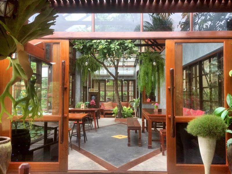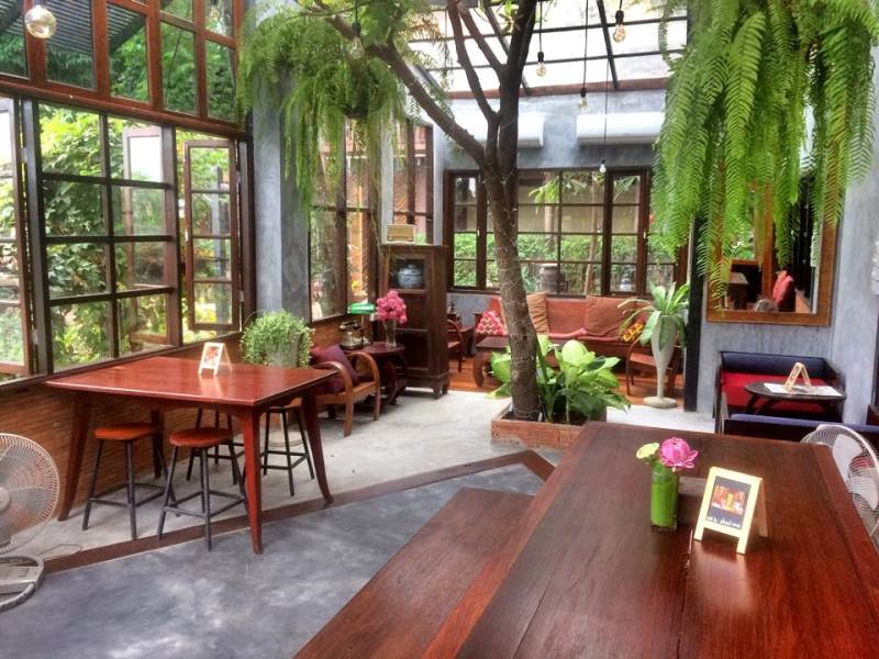 ภายในร้านเป็นปูนเปลือยแบบสมัยใหม่ที่รายล้อมด้วยกระจก ผสานกับไม้เก่าและของตกแต่งแบบไทยๆ ให้ความรู้สึกผ่อนคลาย สบายตา