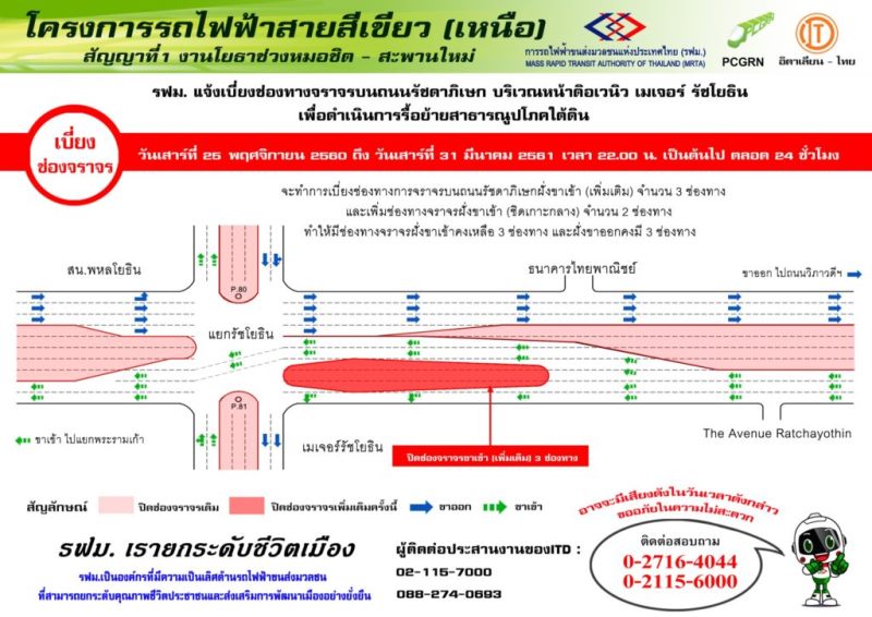ผู้สื่อข่าวรายงานว่า การรถไฟฟ้าขนส่งมวลชนแห่งประเทศไทย (รฟม.) แจ้งว่า บริษัท อิตาเลียนไทย ดีเวล๊อปเมนต์ จำกัด (มหาชน) ผู้รับจ้างก่อสร้างงานโยธา โครงการรถไฟฟ้าสายสีเขียว (เหนือ) ช่วงหมอชิต – สะพานใหม่ – คูคต สัญญาที่ 1 จะดำเนินการรื้อย้ายสาธารณูปโภคใต้ดิน บริเวณด้านหน้า ดิ อเวนิว เมเจอร์ รัชโยธิน