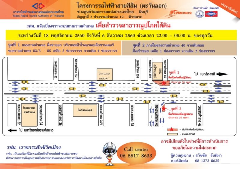 นอกจากนี้ รฟม.ยังแจ้งเบี่ยงจราจรบนถนนรามคำแหง ระหว่างซอยรามคำแหง 83/3 – 85 และภายในซอยรามคำแหง 40 เพื่อสำรวจสาธารณูปโภคใต้ดิน โครงการรถไฟฟ้าสายสีส้ม ช่วงศูนย์วัฒนธรรมแห่งประเทศไทย – มีนบุรี ระหว่างวันที่ 18 พฤศจิกายน 2560 ถึงวันที่ 6 ธันวาคม 2560 ช่วงเวลา 22.00 – 05.00 น. ของทุกวัน