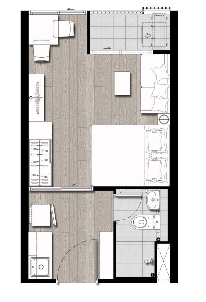 ทั้งโครงการมีอยู่ไม่กี่ยูนิต สำหรับ 1-ห้องนอน 23.5 ตรม. โดย Layout แปลกกว่าชาวบ้านเล็กน้อยคือ เป็นยูนิตหน้าแคบแต่ลึกครับ เหมาะกับอาศัย 1-2 คน และพื้นที่ครัวปิด เหมาะกับทำอาหารหนักๆ แบบไม่ต้องกังวลเรื่องกลิ่น