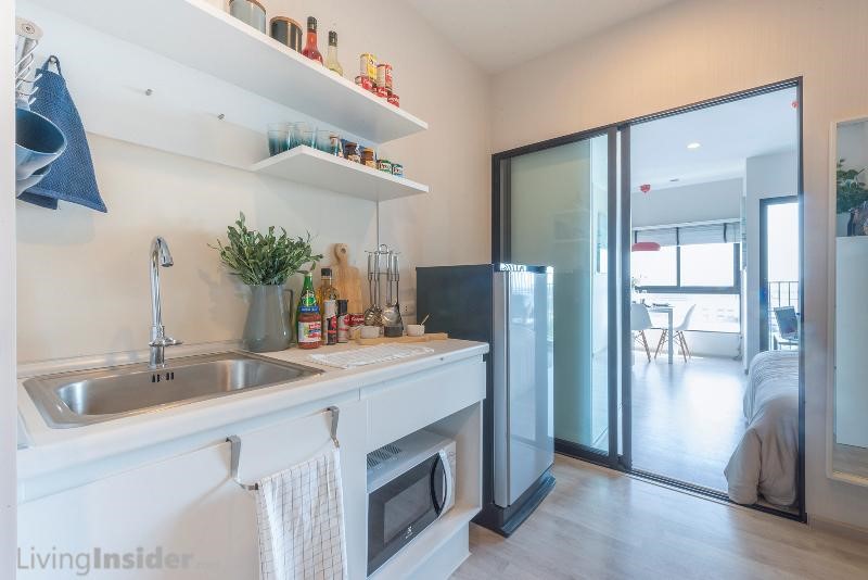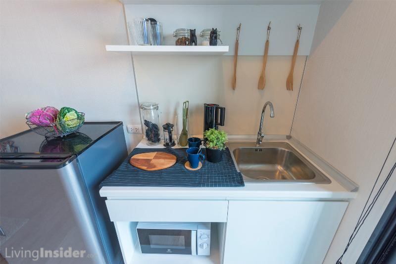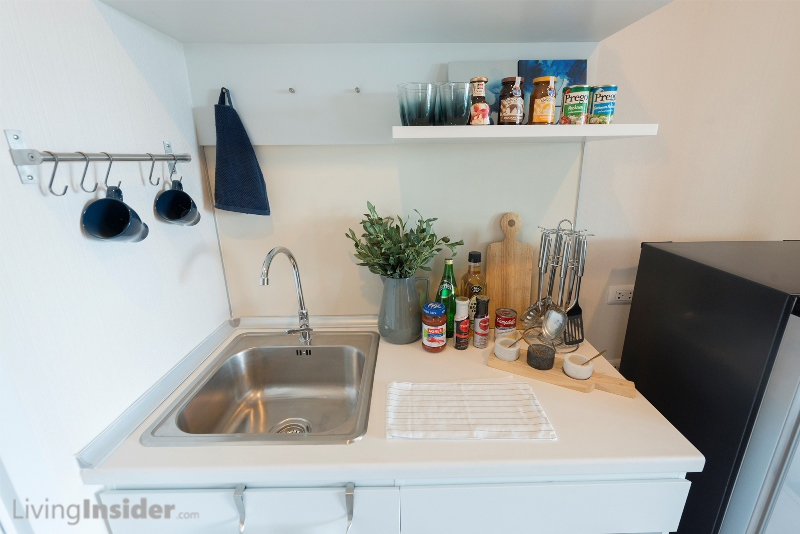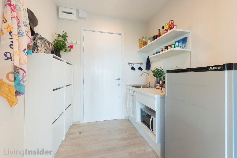 เปิดห้องเข้ามาพบกับพื้นที่ครัวครับ Pantry มีขนาดพอดีๆ สำหรับประกอบอาหาร Top ลามิเนต มีชั้นวางของบิวท์อินให้ ส่วนตรงข้าม ห้องตัวอย่างวางตู้ลิ้นชัก / บานพับ เป็นไอเดียคร่าวๆ ผู้อาศัยสามารถบิวท์อินตู้เก็บของเพิ่มได้เช่นกัน