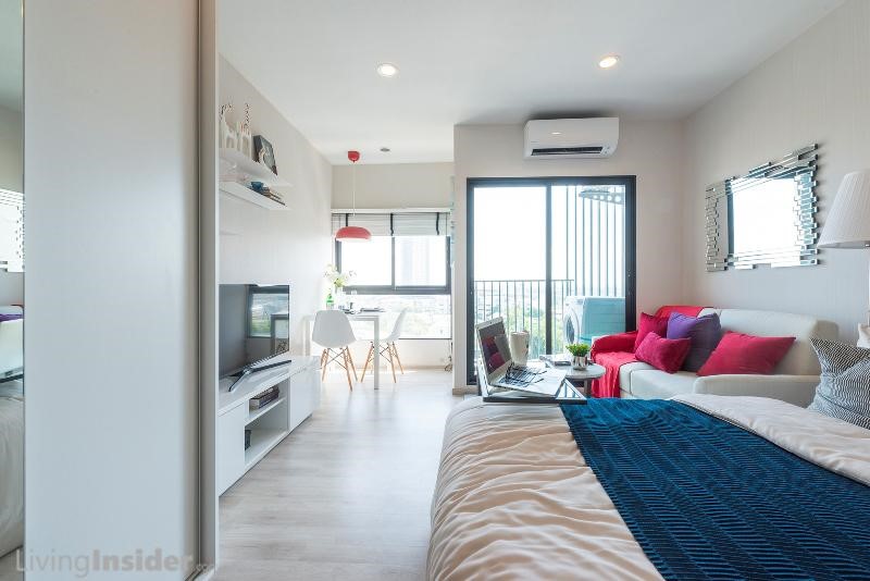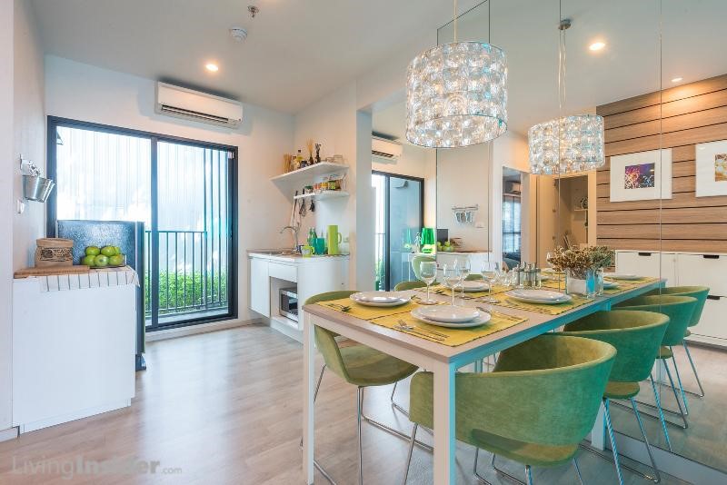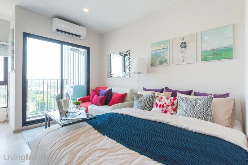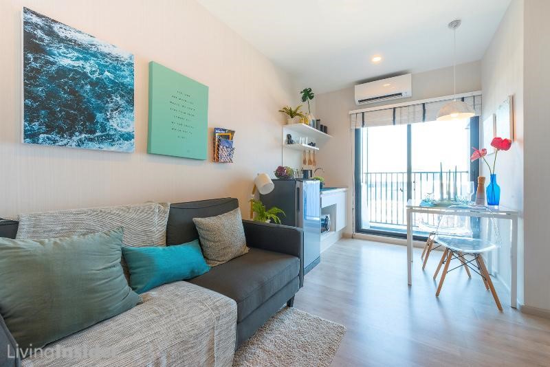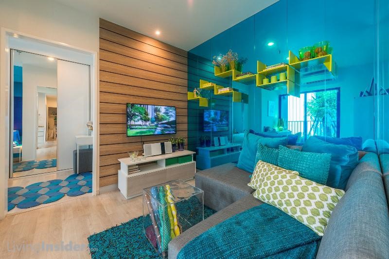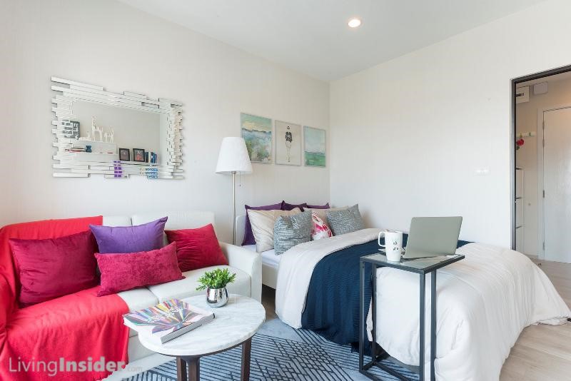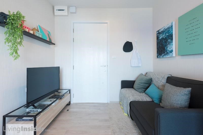 ส่วน Living คล้ายยูนิต Studio พื้นที่โล่งๆ สามารถปรับเปลี่ยนตามใจชอบ ห้องตัวอย่างจัดเตียงขนาด 5 ฟุต โซฟา 2 ที่นั่ง ชั้นวางทีวี พร้อมโต๊ะทานอาหาร 2 ที่นั่ง เข้ามุมห้องพอดี