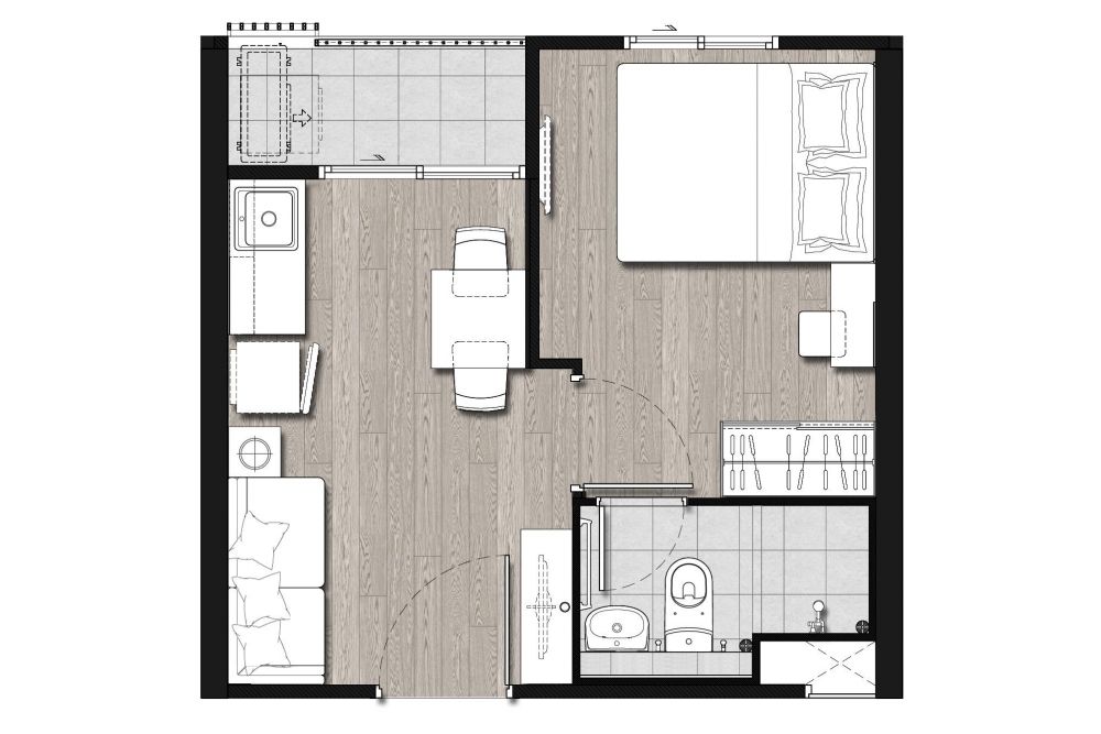 เท่าที่ลองให้หลายคนดู Layout ภาพจริง บอกตรงกันครับว่าดูกว้างดี ไม่อึดอัด 1-ห้องนอน ประเภทนี้มีจำนวนมากที่สุดในโครงการ โดยขนาด 24-26.25 ตรม. ต่างกันเฉพาะขนาดครับ เหมาะกับอาศัย 1-2 คนกำลังดีครับ