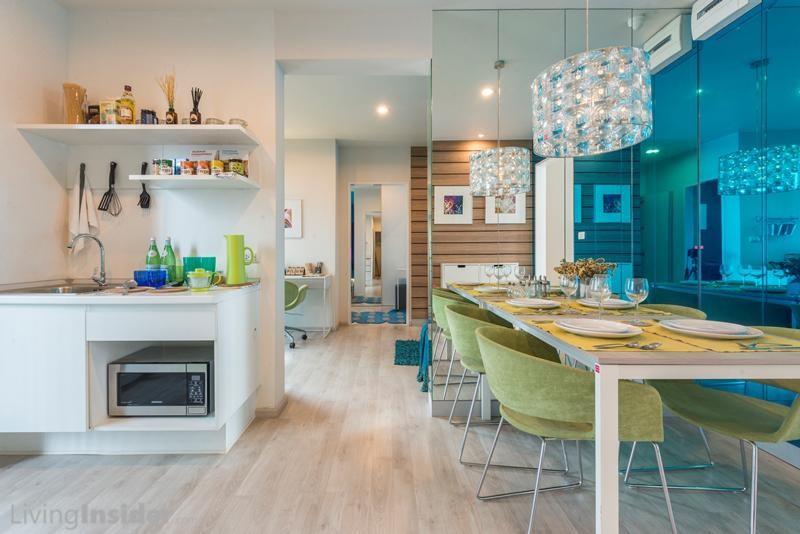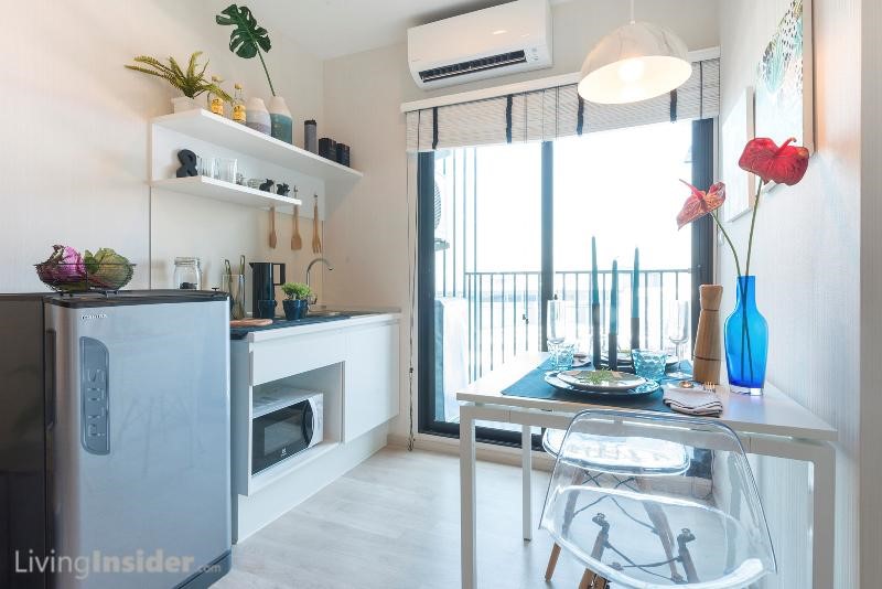 เปิดประตูเข้ามาพบกับส่วนครัว (Kitchen) พร้อมโต๊ะทานอาหาร 4 ที่นั่ง พื้นที่ครัว จริงๆห้องนี้ พื้นที่ครัวถือว่าไม่เล็กนะครับ ใช้งานได้มากกว่าแบบ 1 ห้องนอนมากๆ พื้นที่ระเบียงเหมาะกับใช้ตากผ้า