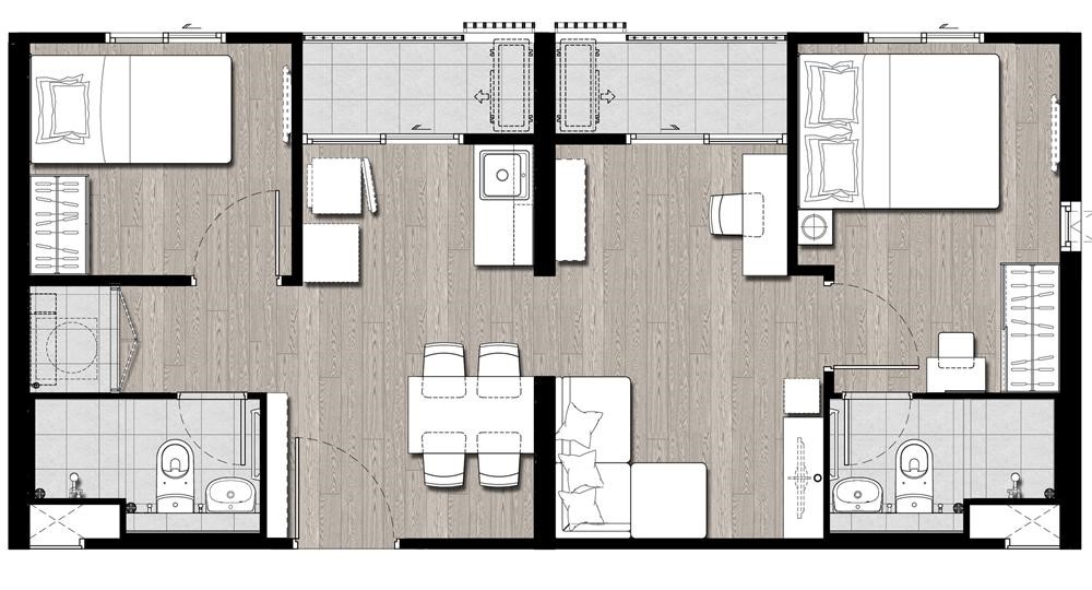 ยูนิต 2 ห้องนอน เท่ากับนำ 1 ห้องนอน มารวมกัน 2 ยูนิตนั่นเอง อย่างไรก็ดี โครงการมีการ Fixed ตำแหน่งไว้คือ หมายเลข 28-29 ของเฟส 1 เหมาะกับอาศัย 2-3 คนครับ ห้องใหญ่ไม่อึดอัด แถมเป็น 2-Bed / 2-Bath ซะด้วย ลงตัวมากๆครับ เหมาะสำหรับอยู่เป็นครอบครัว พ่อ แม่ ลูกได้เลย