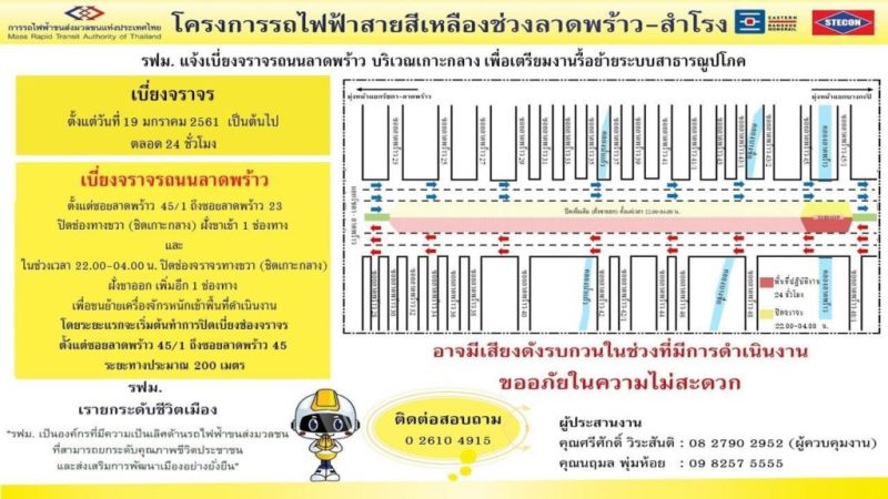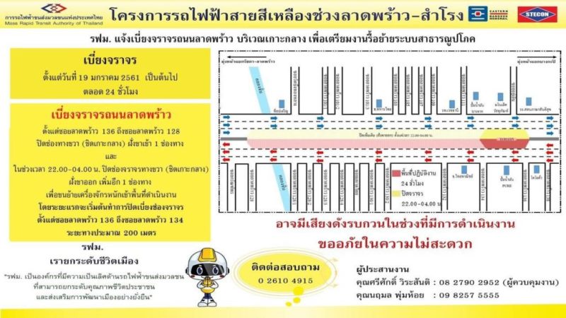 ผู้สื่อข่าวรายงานว่า ทางผู้รับเหมาก่อสร้างโครงการรถไฟฟ้าสายสีเหลืองลาดพร้าว-สำโรง จะเริ่มปิดเบี่ยงจราจร 24 ชั่วโมง ในวันที่ 19 มกราคม 2561 ตั้งแต่เวลา 22.00 น. เป็นต้นไป