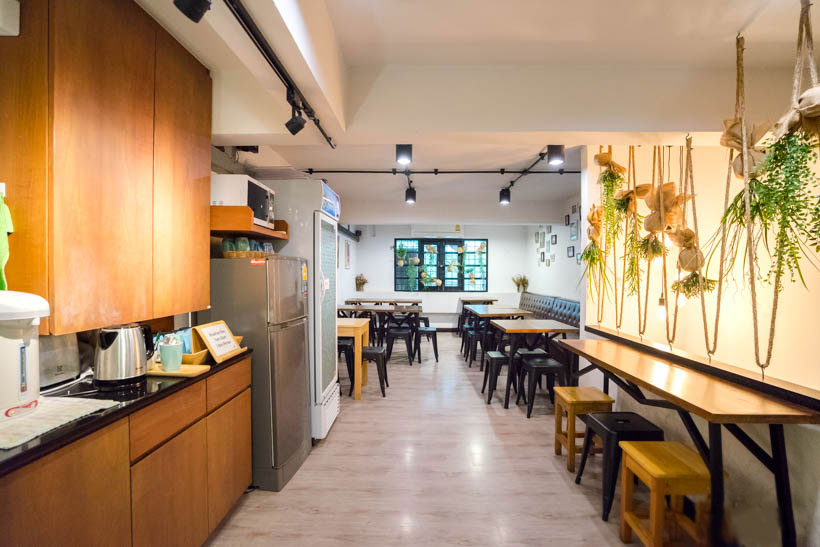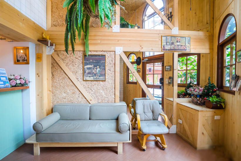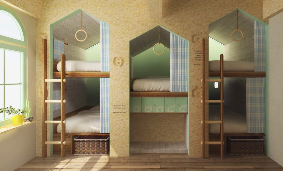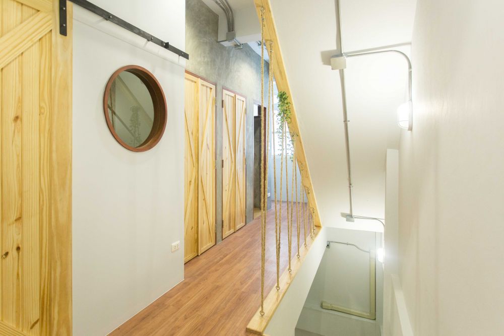 ซึ่งทาง hostel เลือกไม้เป็นวัสดุหลักของการตกแต่ง ไม่ว่าจะเป็นเตียงนอน พื้นที่ common area,reception area ที่มีสีสันพาสเทลกับเฟอร์นิเจอร์ตกแต่งที่คัดสรรมาอย่างดี ทั้งตู้นอนของแต่ละเตียง ออกแบบมาให้เหมือนบ้านสามเหลี่ยมแบบโรงนา
