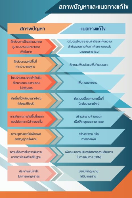 โดยให้พิจารณาความเชื่อมโยงในการกำหนดแนวทางการแก้ไขปัญหาการจราจรทั้งทางด้านสาธารณูปโภคพื้นฐาน การบังคับใช้กฎหมาย การกำหนดมาตรการนโยบายต่างๆ รวมทั้งการวางแผนพัฒนาเมืองให้ไปในทิศทางเดียวกัน รัฐบาลจึงเร่งพัฒนาด้านสาธารณูปโภคพื้นฐานให้สอดคล้องกับการวางแผนพัฒนาเมือง และส่งเสริมให้ประชาชนใช้ระบบขนส่งสาธารณะเพิ่มขึ้น
