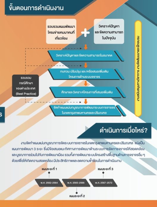 นายชยธรรย์ พรหมศร รองผอ.สนข.กล่าวว่า สนข.ได้จัดทำแผนแม่บทบูรณาการพัฒนาระบบการจราจรในเขตกรุงเทพมหานครและปริมณฑล ทั้งทางถนน ทางราง และทางน้ำ ในช่วงปี 2560-2572 แบ่งออกเป็นแผนการพัฒนา 3 ระยะ ประกอบด้วย แผนระยะที่ 1 พ.ศ. 2562-2564 แผนระยะที่ 2 พ.ศ. 2565-2566 และแผนระยะที่ 3 พ.ศ. 2567-2572 ซึ่งมีข้อเสนอแนะทิศทางการพัฒนาด้านระบบการจัดการจราจรให้สอดคล้องและบูรณาการร่วมไปกับการพัฒนาเมือง