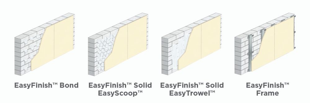 • อีซี่ฟินิช ระบบโซลิด โดยใช้อุปกรณ์อีซี่สคู๊ป (EasyFinishTM Solid System EasyScoopTM Application) สำหรับผนังก่ออิฐหรือคอนกรีตที่ต้องการความเรียบเนียนและให้ความรู้สึกทึบตัน ติดตั้งด้วยอุปกรณ์ อีซี่สคู๊ป (EasyScoop™) สามารถทำงานได้เร็วกว่าถึง 2 เท่าระบบนี้เหมาะสำหรับผนังในพื้นที่ที่มีความเสี่ยงต่อการถูกชนหรือกระแทก