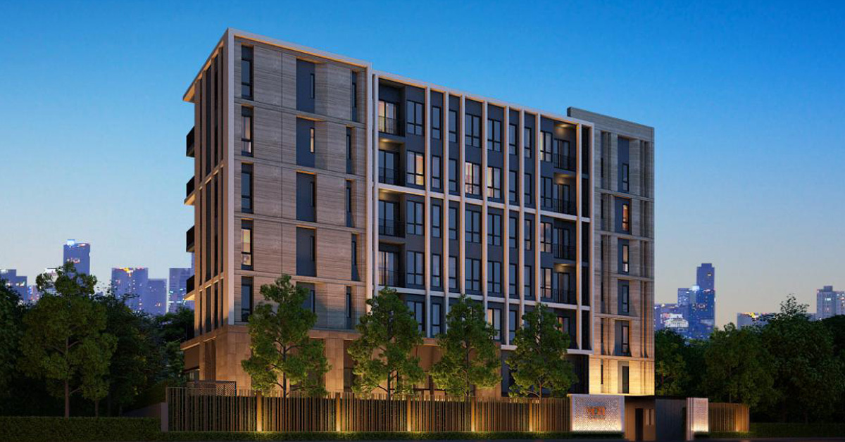 มาซูมกันใกล้ๆ ให้เห็นถึงเนื้องานดีไซน์ของภายนอกโครงการ ที่ผสมผสานความโมเดิร์นของแกรนิตสีปูนเปลือยที่วางสับหว่างกัน สีอ่อนตัดสีแก่สร้างจังหวะสม่ำเสมอไปเรื่อยๆ ตัดกับกระจกทรงสูงกรอบสีดำ เสริมความโมเดิร์น และโชว์ความหรูหราให้เห็นพื้นที่ใช้สอยส่วนกลางภายใน ขณะที่ส่วนต่างๆ ของโครงการก็แซมงานดีไซน์เอกลักษณ์แบบชาวตะวันออกไป เช่น ของตกแต่งในสวนที่เลียนแบบลวดลายมาจากงานจักสานของไทย เป็นต้น