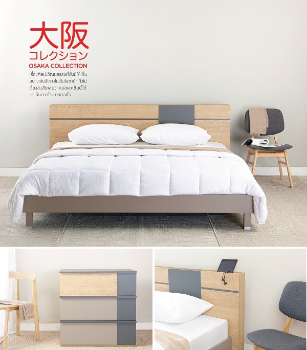 ขณะที่ โอซาก้า (Osaka Series) ได้เผยเสน่ห์ของงานดีไซน์ ด้วยการนำโทนเนื้อไม้ธรรมชาติแมตช์เข้ากับโทนสีเทา 2 โทนสีเข้าด้วยกันลงตัวได้กับทุกรูปแบบชีวิตทันสมัย กับชุดห้องนอนครบชุด ประกอบไปด้วยเตียง ตู้เสื้อผ้า โต๊ะเครื่องแป้ง