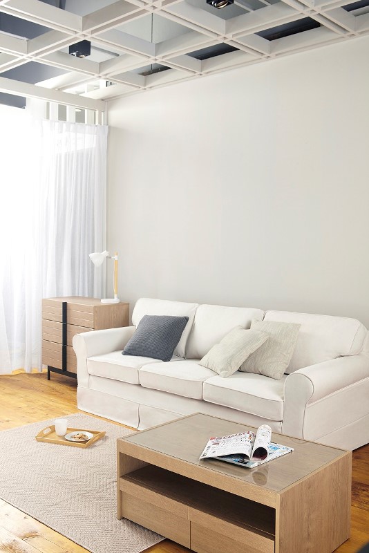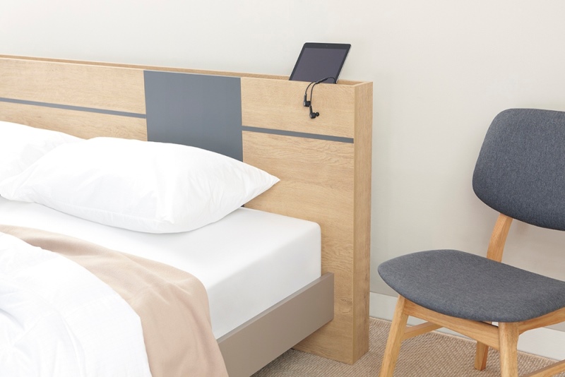 ทำให้พื้นที่ภายในบ้านดูกว้างขวาง โดยเลือกใช้วัสดุหลักจากไม้ที่เพิ่มความรู้สึกอบอุ่น โดยใช้โทนสีเนื้อไม้ สีเทา สีขาว และดีไซน์ด้วยการนำแผ่นไม้ที่เรียงตัวมาเป็นเฟอร์นิเจอร์ซึ่งการเรียงตัวของเนื้อไม้ช่วยสะท้อนความเป็ยระเบียบ เรียบง่ายได้เป็นอย่างดี แต่ฟังก์ชั่นการใช้งานซ่อนไว้ภายในอย่างมีประสิทธิภาพ เช่น หัวเตียงที่เสริมฟังก์ชั่นจัดเก็บของ หรือตู้ข้างเตียง ที่ออกแบบให้ต่อเสริมเข้ากับเตียงนอนได้เรียบเนียน