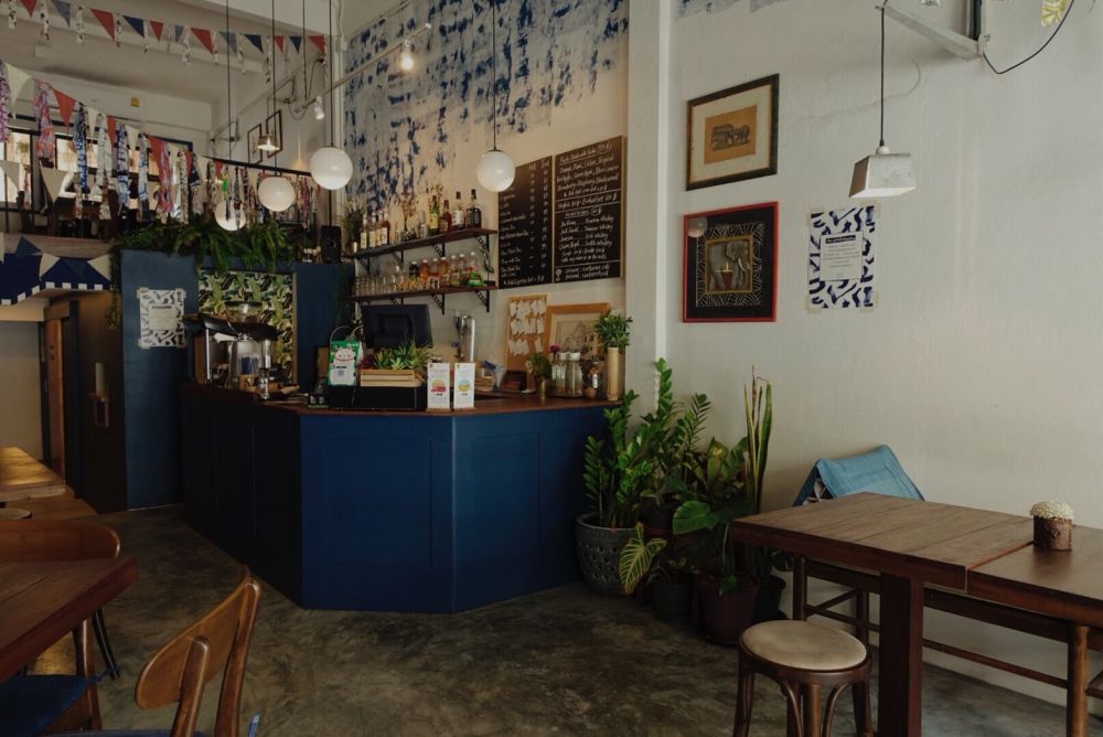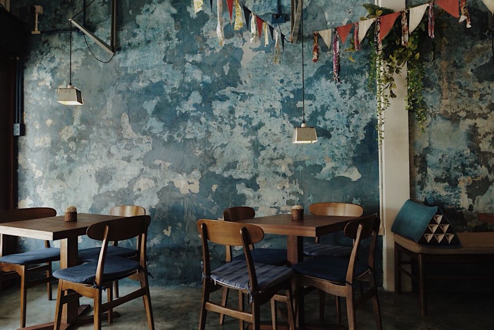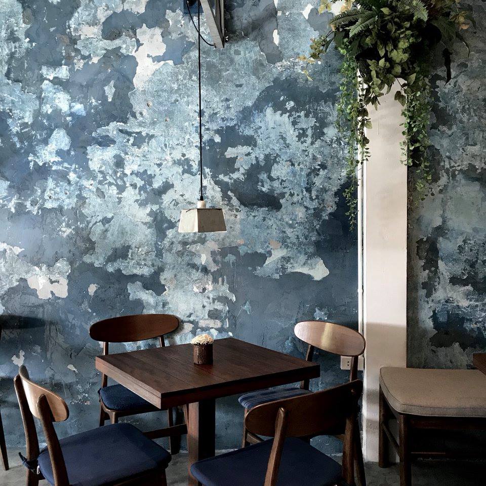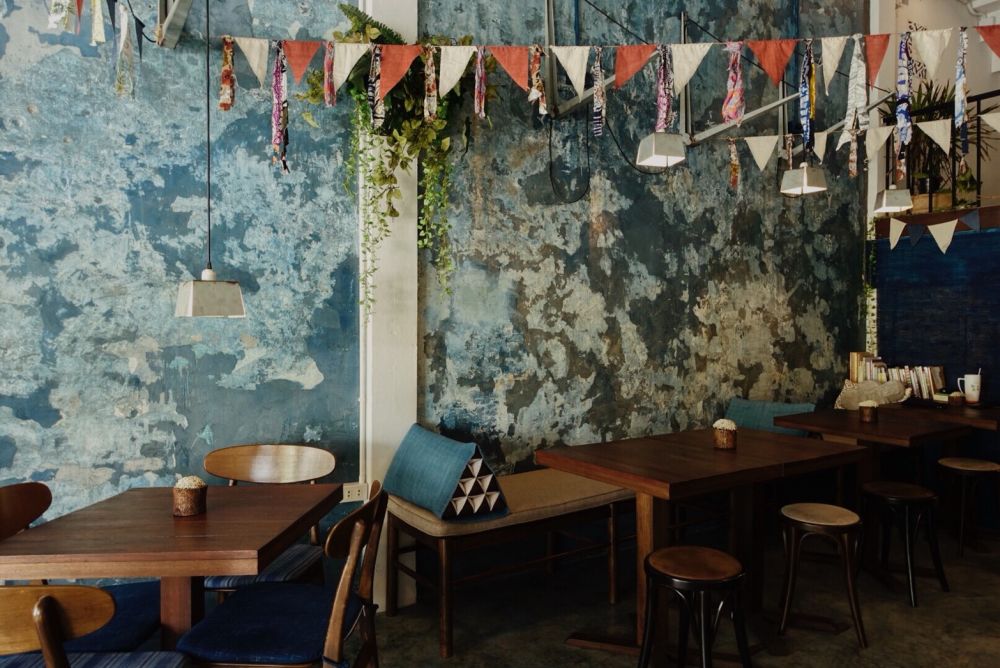 ส่วนเรื่องการตกแต่ง โทนสีหลักของที่ร้านคือสี indigo blue (สีน้ำเงินคราม) ที่ได้แรงบันดาลใจมาจากสีของผ้า ม่อฮ่อม ครั้งเมื่อเดินทางไปจังหวัดแพร่ ซึ่งผ้าม่อฮ่อม เป็นผ้าจากทางภาคเหนือ จริงๆแล้วก็มีอยู่ด้วยกันหลายจังหวัด ของที่ร้านใช้ผ้าม่อฮ่อมธรรมชาติจากจังหวัดแพร่ ตัดสลับด้วยสีน้ำตาลเข้มจากเฟอร์นิเจอร์งานไม้เพื่อให้ดูไม่เลี่ยนจนเกินไป
