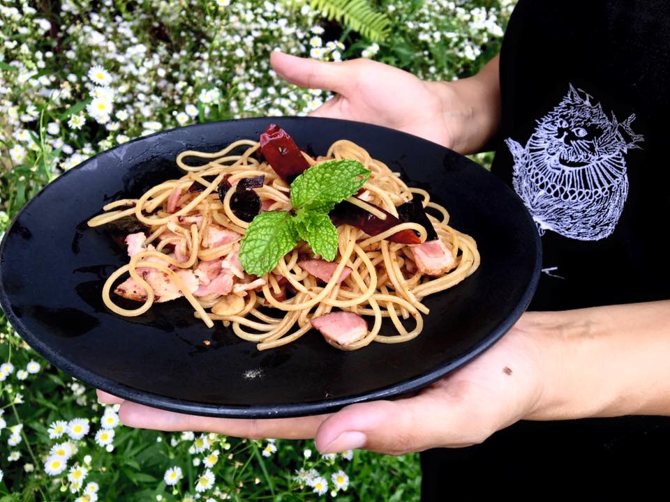 มาที่เมนูแรก กับ Spaghetti bacons and spicy สปาเก็ตตี้เบคอนผัดพริก ไม่เผ็ดมาก