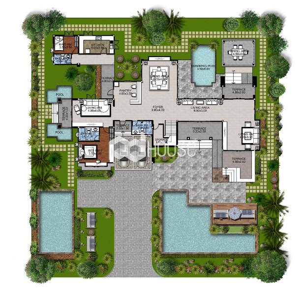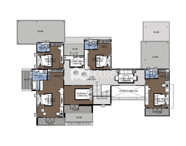 โดยพื้นที่หน้าบ้านเปิดกว้างให้อากาศถ่ายเทเข้าสู่ภายในตัวบ้านได้ดี สามารถสัมผัสธรรมชาติและนั่งพักผ่อนหน้าบ้านในยามเช้า-เย็นได้อย่างลงตัว เหมาะสำหรับครอบครัวใหญ่ที่ชื่นชอบความทันสมัย ประกอบด้วย 5 ห้องนอน 6 ห้องน้ำ และที่จอดรถ 2 คัน พร้อมอาคารแม่บ้าน และส่วนบริการครบครัน มีพื้นที่ใช้สอยรวม 710 ตารางเมตร