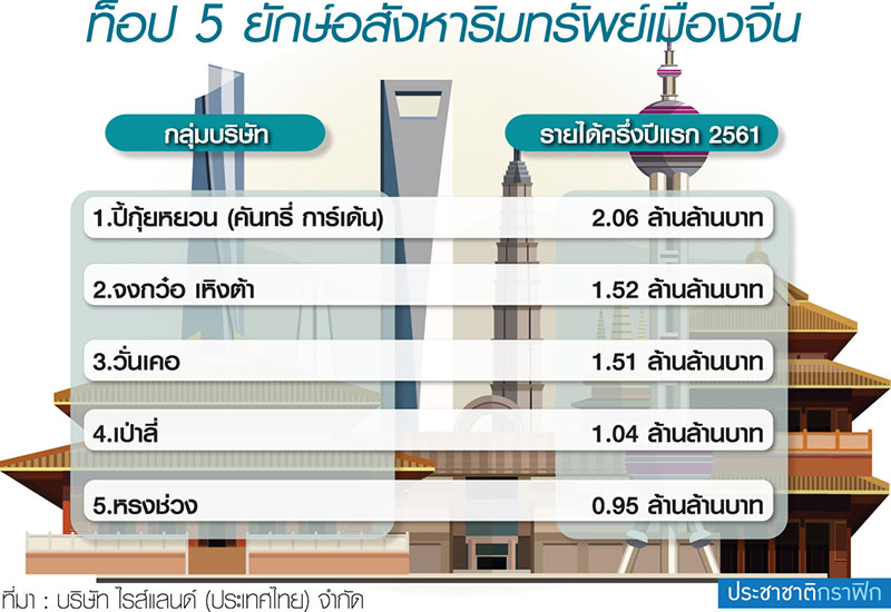 อันดับ 1 กลุ่มปี้กุ้ยหยวน คนไทยและคนทั่วโลกน่าจะคุ้นกันดีในชื่อของกลุ่มคันทรี่ การ์เด้น พบว่ารายได้ครึ่งปีแรก 2561 อยู่ที่ 4.124 แสนล้านหยวน หรือ 2.06 ล้านล้านบาท (ดูตารางประกอบ)
