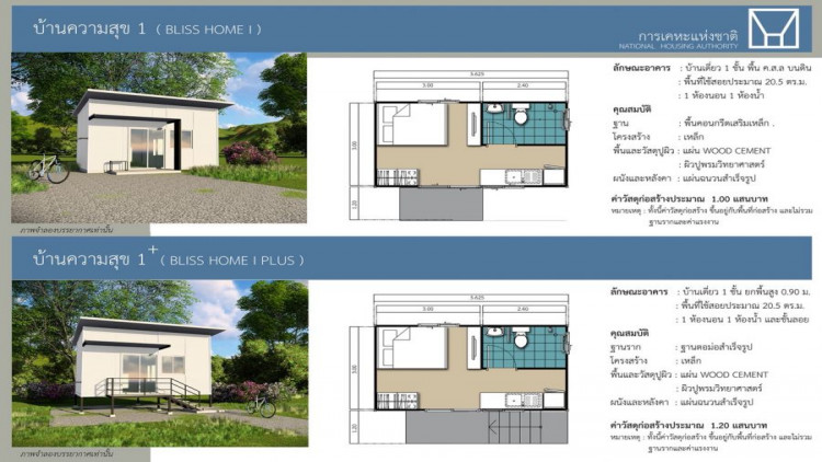 ลักษณะเป็นบ้านเดี่ยวชั้นเดียว ก่อสร้างด้วยระบบชิ้นส่วนสำเร็จรูปตามขนาดพิกัดวัสดุก่อสร้าง (Modular System) ที่รวดเร็ว ไม่เกิน1 เดือน ก็สร้างบ้านได้แล้ว มีความแข็งแรง ปลอดภัย อยู่สบาย ส่วนราคาค่าวัสดุก่อสร้างประมาณ 80,000 - 200,000 บาท ขึ้นอยู่กับพื้นที่ก่อสร้าง ซึ่งไม่รวมฐานรากและค่าแรงงาน ขณะนี้อยู่ระหว่างการหารือกับกรมธนารักษ์ กระทรวงการคลัง เพื่อหาแนวทางความเป็นไปได้ในการจัดสร้างบนที่ดินของกรมธนารักษ์