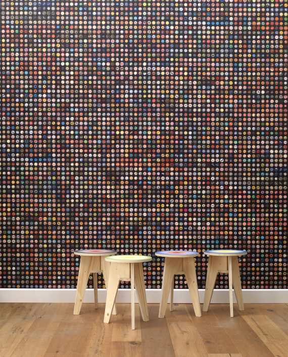 ศิลปะบนฝาผนังที่ประดับด้วยฝาเครื่องดื่มต่างๆ ถือเป็นไอเดียสุดบรรเจิดโดย JEANINE EEK KEIZER ที่เลือกใช้วัสดุรอบตัวมาสร้างสรรค์งานศิลปะได้อย่างครีเอทสุด ๆ เพื่อเพิ่มความสนุกให้เก็บพื้นที่เล็กๆ ของคุณด้วยสีสันสดใส ช่วยให้ห้องดูมีชีวิตชีวามากขึ้น เหล่านักสะสมของของเก่าคงตกหลุมรักวอลเปเปอร์ลายนี้ได้ไม่ยาก
