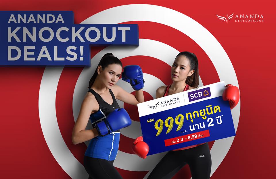 ฝ่ายประชาสัมพันธ์ บริษัท อนันดา ดีเวลลอปเม้นท์ จำกัด (มหาชน) กล่าวว่า อนันดาฯ จัดโปรโมชัน “ANANDA Knockout Sale” วันที่ 7-9 กันยายน 2561 นำคอนโดฯ 14 โครงการทำเลใกล้สถานีรถไฟฟ้าและคอนโดพร้อมอยู่ เสนอแพ็กเกจสินเชื่อผ่อนเดือนละ 999 บาททุกยูนิต นาน 2 ปี ราคาเริ่ม 2.3-6.99 ล้านบาท