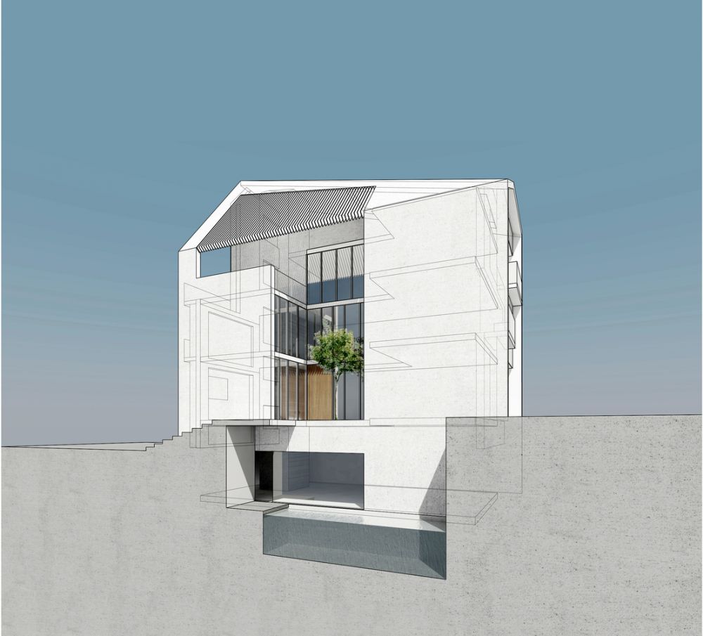 นี่จึงเป็นทำเลแห่งใหม่ของหนึ่งในงานสถาปัตยกรรมบ้านสุดสร้างสรรค์ที่มีทัศนียภาพเพียบพร้อมทั้งป่าและหุบเขา ผลงานจากทีมสถาปัตยกรรม ROEWU ซึ่งความท้าทายก็คือออกแบบบ้านในพื้นที่จำกัดให้ดึงทัศนียภาพแห่งธรรมชาติมาเป็นส่วนหนึ่งในการออกแบบให้มากที่สุด ซึ่งทางทีมสถาปัตฯ ได้ออกแบบโครงสร้างบ้านในรูปทรงเอียง มีช่องว่างระหว่างตัวบ้านเพื่อรับแสงแดดธรรมชาติ และให้ลมหมุนเวียนได้ทุกชั้นของตัวบ้าน