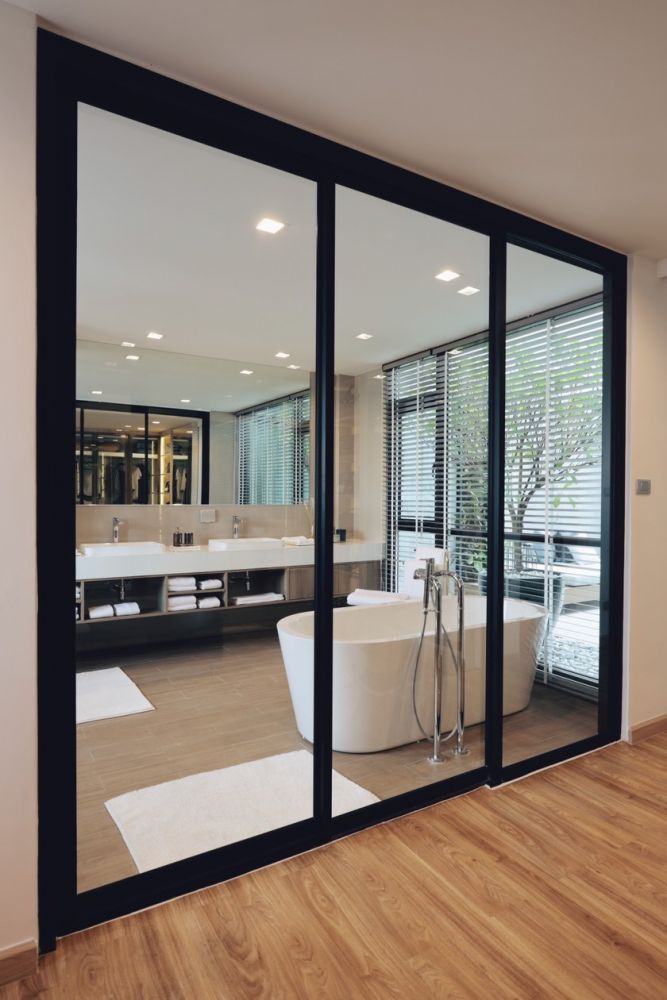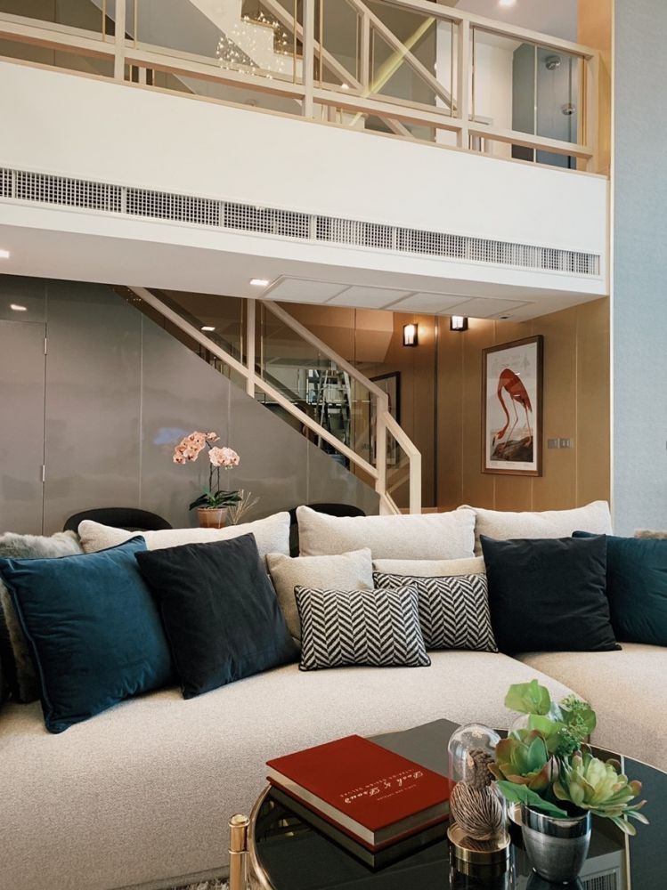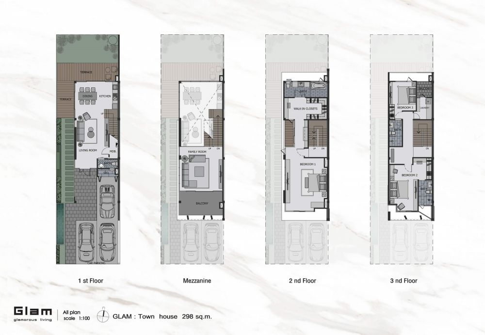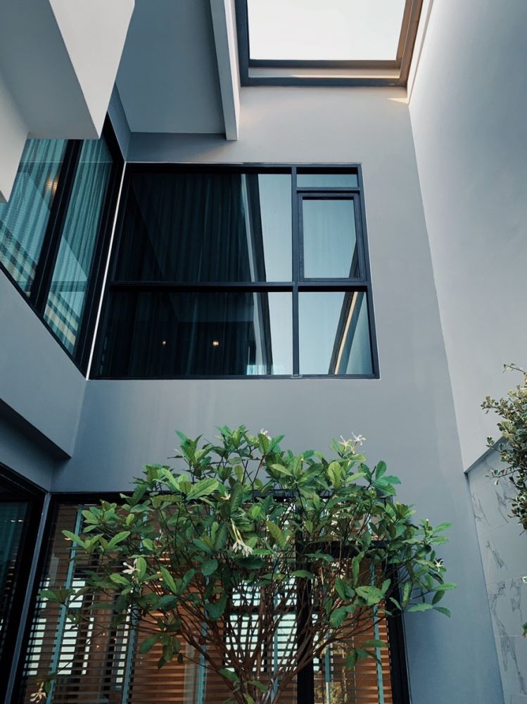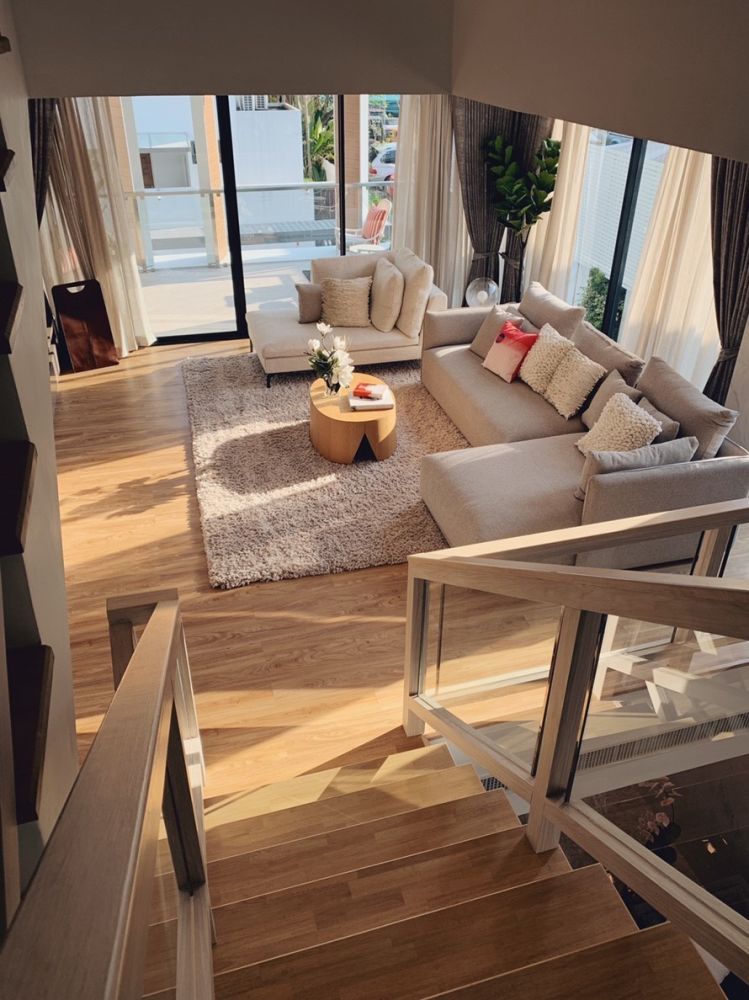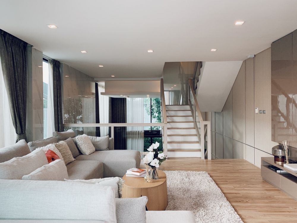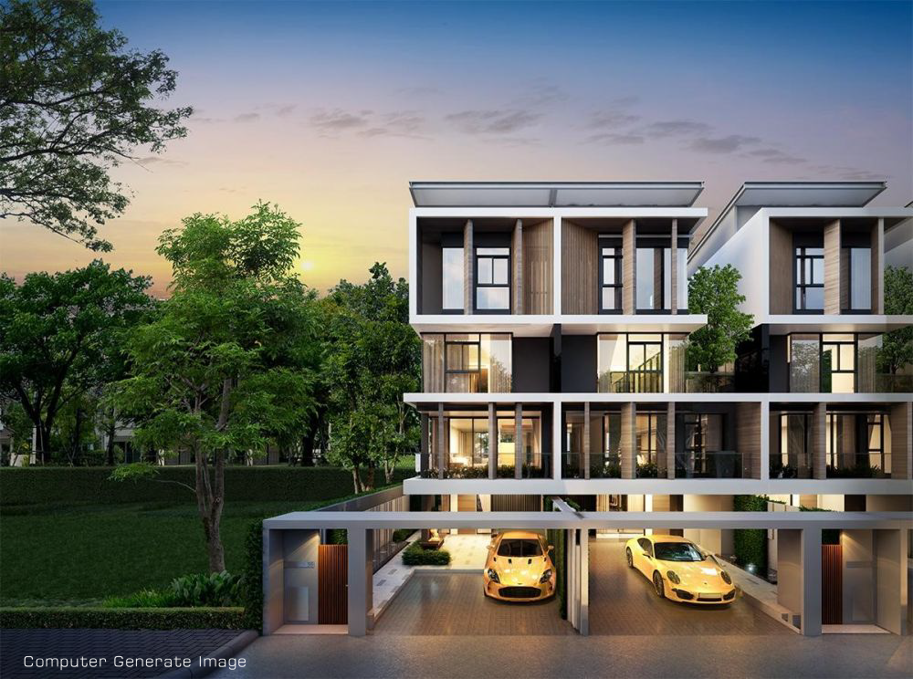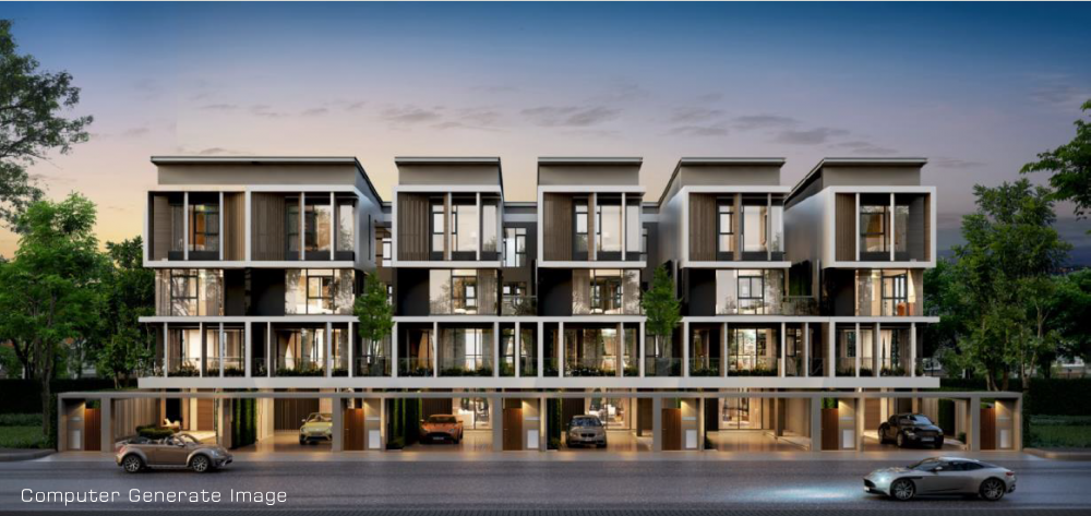 มาในส่วนของตัวบ้านมีพื้นที่ใช้สอยเริ่มต้น 298 ตารางเมตร เทียบเท่าบ้านเดี่ยวขนาดใหญ่ ตกแต่งสไตล์ “Modern Glamorous Architecture Style” หรูหราทันสมัย ออกแบบให้มีเพดานสูง 5.2 เมตร (Double Height) หน้ากว้าง 5 เมตร จึงให้ความรู้สึกโปร่งสบาย อีกทั้งยังวาง Layout การใช้สอยได้ลงตัว พร้อมที่จอดรถ 3 คัน และมีห้องเก็บของด้านหน้าอีกด้วย