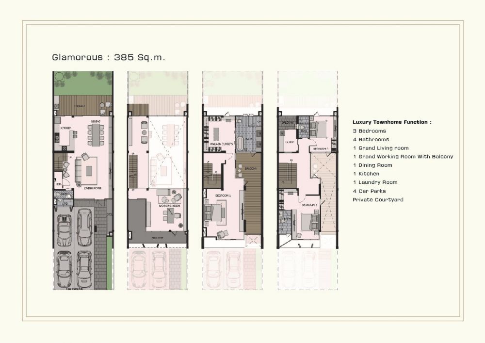 สำหรับ Type 385 ตารางเมตร สามารถจอดรถได้ถึง 4 คัน หน้ากว้างถึง 7 เมตร ในส่วนของด้านในเพิ่มพื้นที่ใช้สอยในส่วนชั้นลอยเพื่อทำเป็น Home Office เพิ่มเติมจากชั้นล่างได้ และยังมี Master Bedroom ที่ชั้น 2 มาพร้อมกับระเบียง (Outdoor Terrace) ขนาดใหญ่