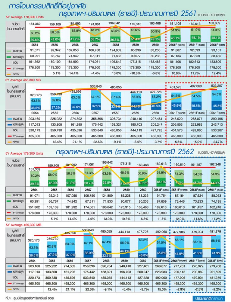 เบื้องต้นพบว่า หลังจากวิกฤตเศรษฐกิจปี 2540 ตลาดอสังหาริมทรัพย์ไทยมีการฟื้นตัวและเติบโตต่อเนื่อง แต่ละปีมีการโอนกรรมสิทธิ์ที่อยู่อาศัย 3.2-3.7 แสนหน่วย มูลค่าเฉลี่ย 6.5-7.5 แสนล้านบาท