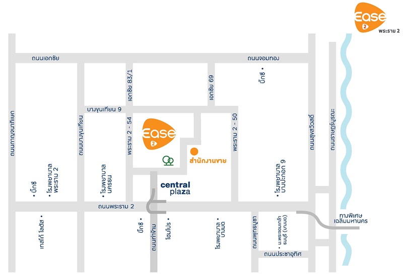 EASE 2 พระราม 2 ตั้งอยู่บน ถ.พระรามสอง ซ.พระรามสอง 54 หรือเอาง่ายๆ ก็คืออยู่หลังเซ็นทรัลพระราม 2 ที่ห่างกันเพียง 800 เมตร พระรามสองเป็นอีกหนึ่งทำเลเพื่อการอยู่อาศัยก็ได้ เพื่อการลงทุนก็ดี เพราะเป็นเส้นทางเข้าออกเมืองที่ค่อนข้างสะดวกสบาย ตั้งอยู่ท่ามกลางแหล่งเศรษฐกิจสำคัญของกรุงเทพฯ ฝั่งตะวันตก แถมยังเป็นเส้นทางออกนอกเมืองไปยังแหล่งท่องเที่ยวสำคัญๆ มากมาย