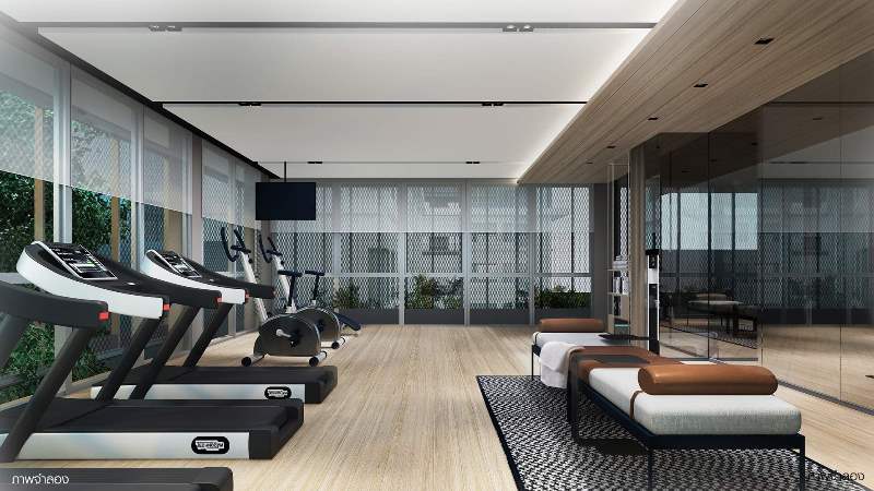 ห้องฟิตเนสชั้น 2 ที่เน้นความโปร่งโล่งด้วยกระจกทรงสูงรอบทิศทาง เปิดรับวิวจากธรรมชาติสีเขียวด้านนอก และมองเห็นวิวสระว่ายน้ำด้านล่าง แต่เพิ่มความส่วนตัวด้วยฉากกั้นบังสายตาและแสงแดด