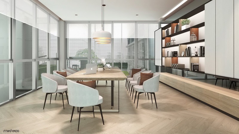 ภาพจำลองห้องประชุมส่วนกลาง บริเวณชั้น 2 ที่มาพร้อมกระจกทรงสูงรอบทิศทางเปิดรับวิวสีเขียวจากด้านนอกเช่นกัน แต่ยังคงเน้นความส่วนตัวด้วยฉากบังสายตาและแสงแดดจากด้านนอก